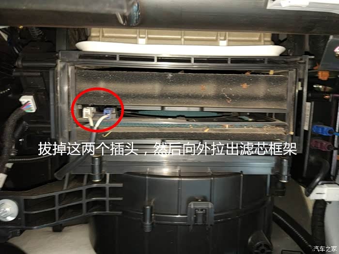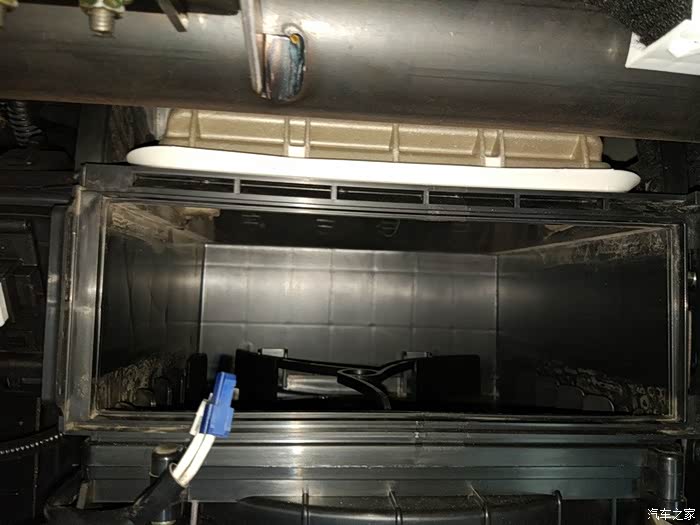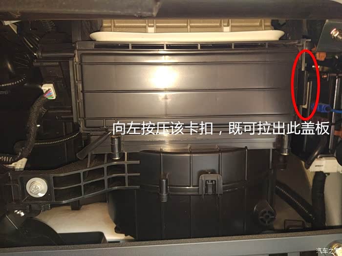 拆下杂物箱就可以看到后面的滤芯盒了,按照图片的指示拉开盖板