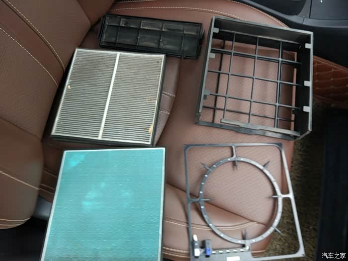 这是滤芯拆解的全家福,其中左上是滤芯盖板,左中是本次要更换的空调滤芯