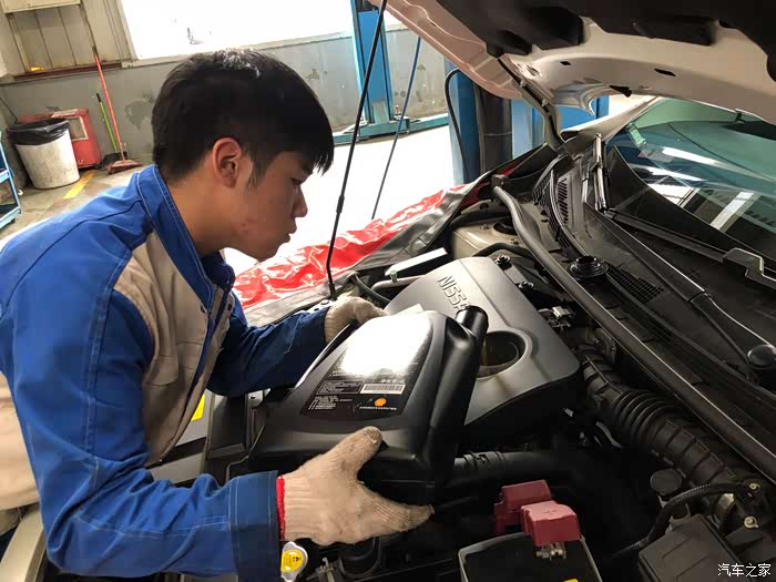 将车辆停放在水平的路面上。拔出游标尺检查机油量,油亮若在( F)和(L)两个标线之内,则属于正常范围,若低于(L)位。则应添加指定型号的机油,加油后的液面不能高于( F)位。机油滤清器应在换机油时与机油一并更换。在常规情况下汽车每行驶 5000km时就需保养一次。