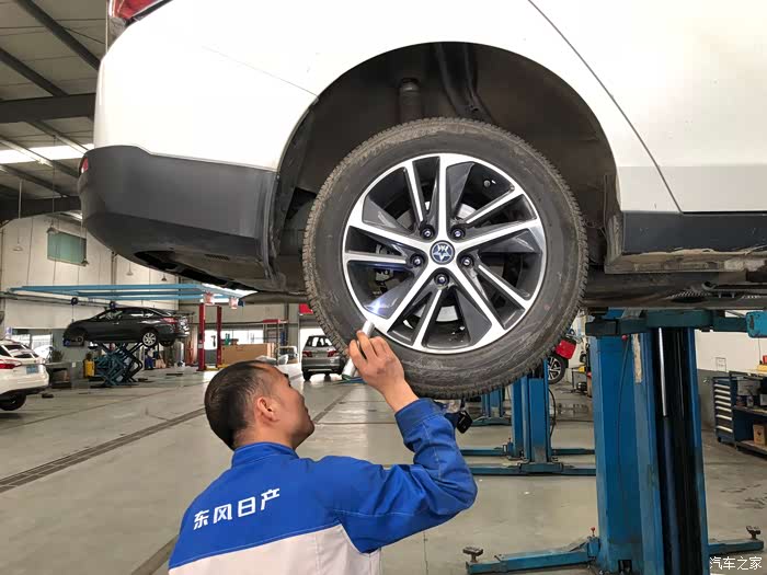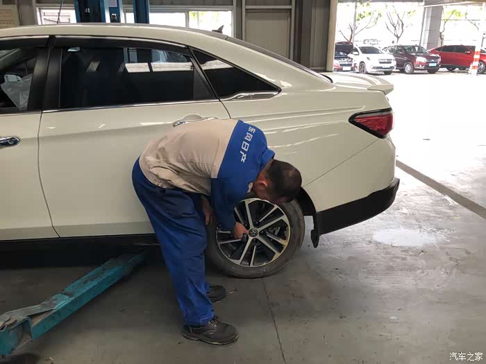正在检查轮胎螺丝是否有松动之类的。