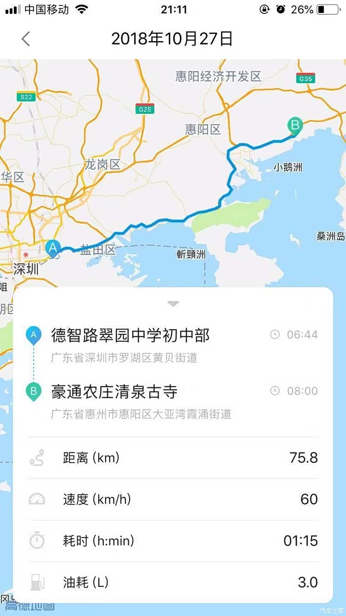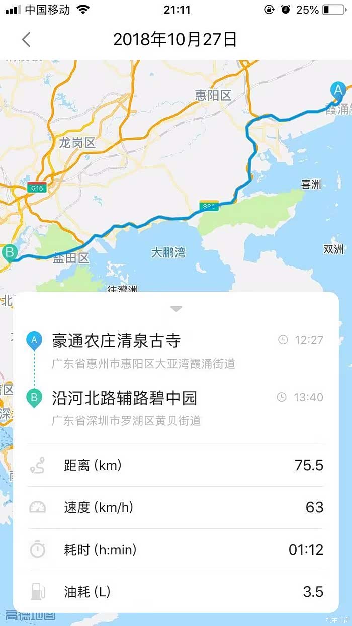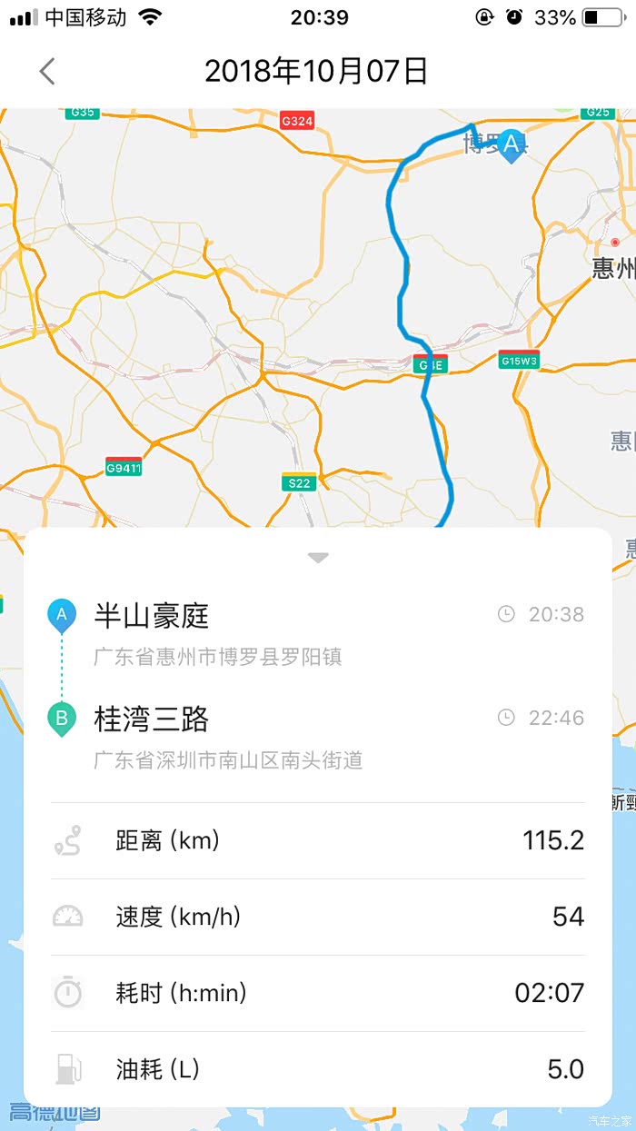 ( 1 ) 电量>40%,深圳-惠州,全程230公里,耗时4小时14分钟,速度54公里/小时,总耗油10L,油耗4.34L/公里。