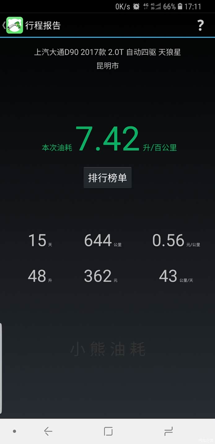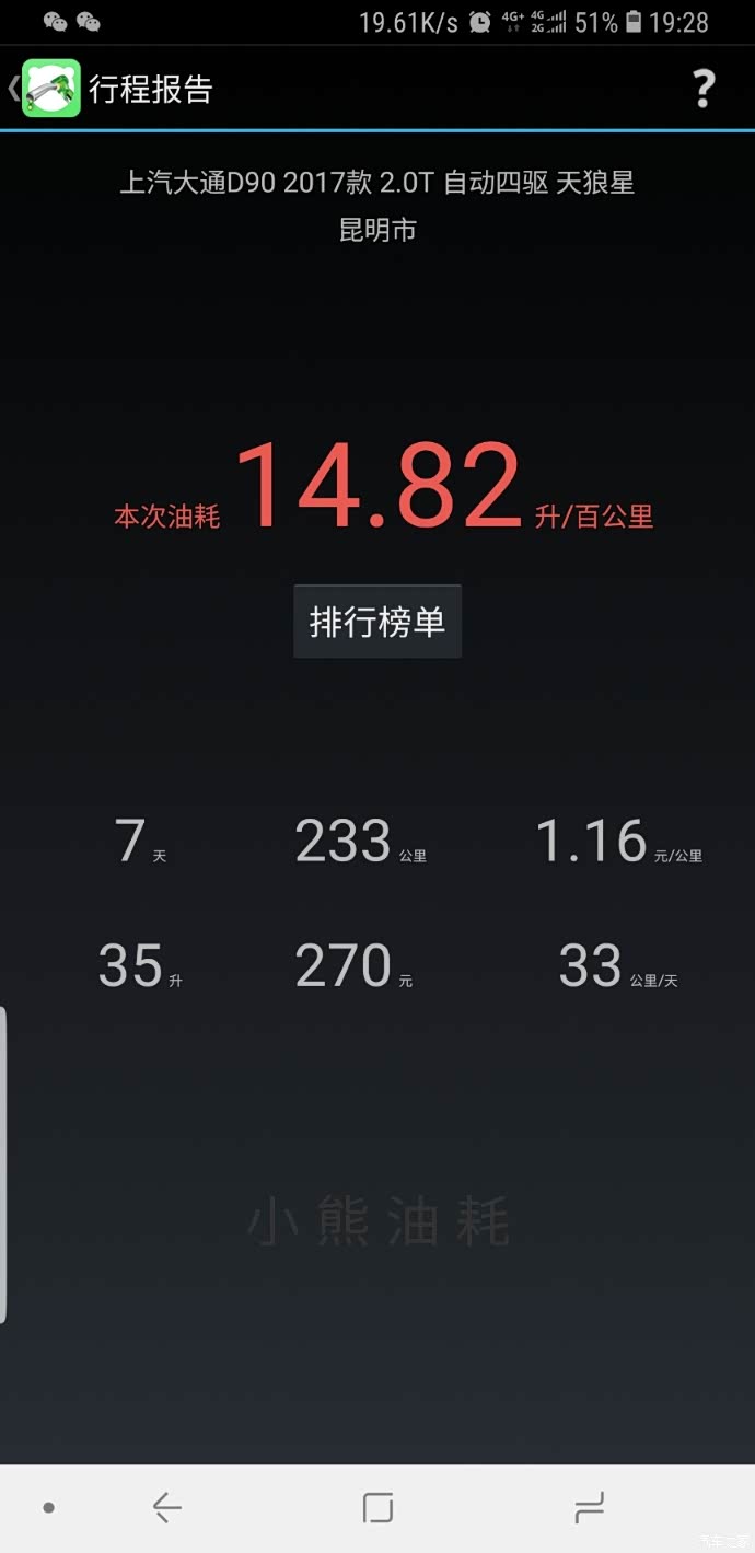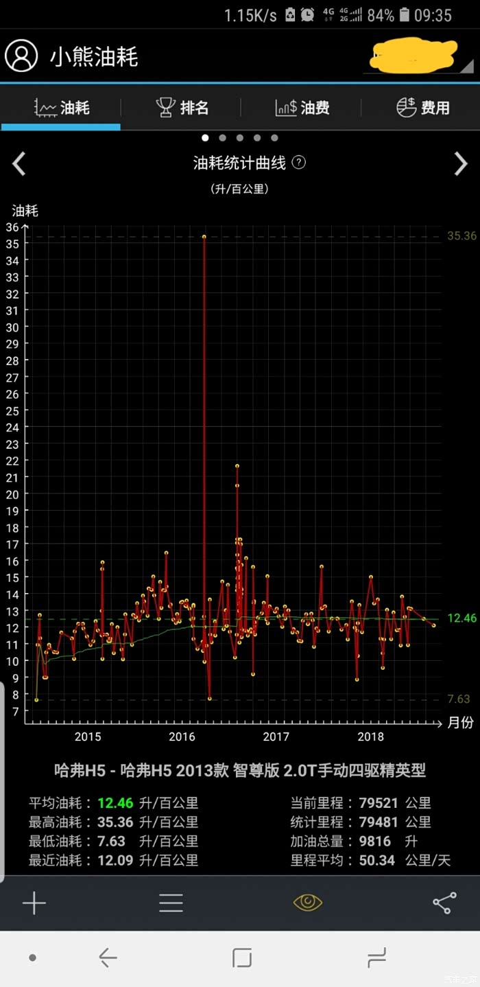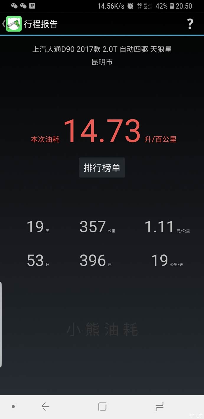 下面是我用小熊油耗统计的,最低百公里7.4个油,最高百公里15.8个油,大部分时间是百公里13个油左右
