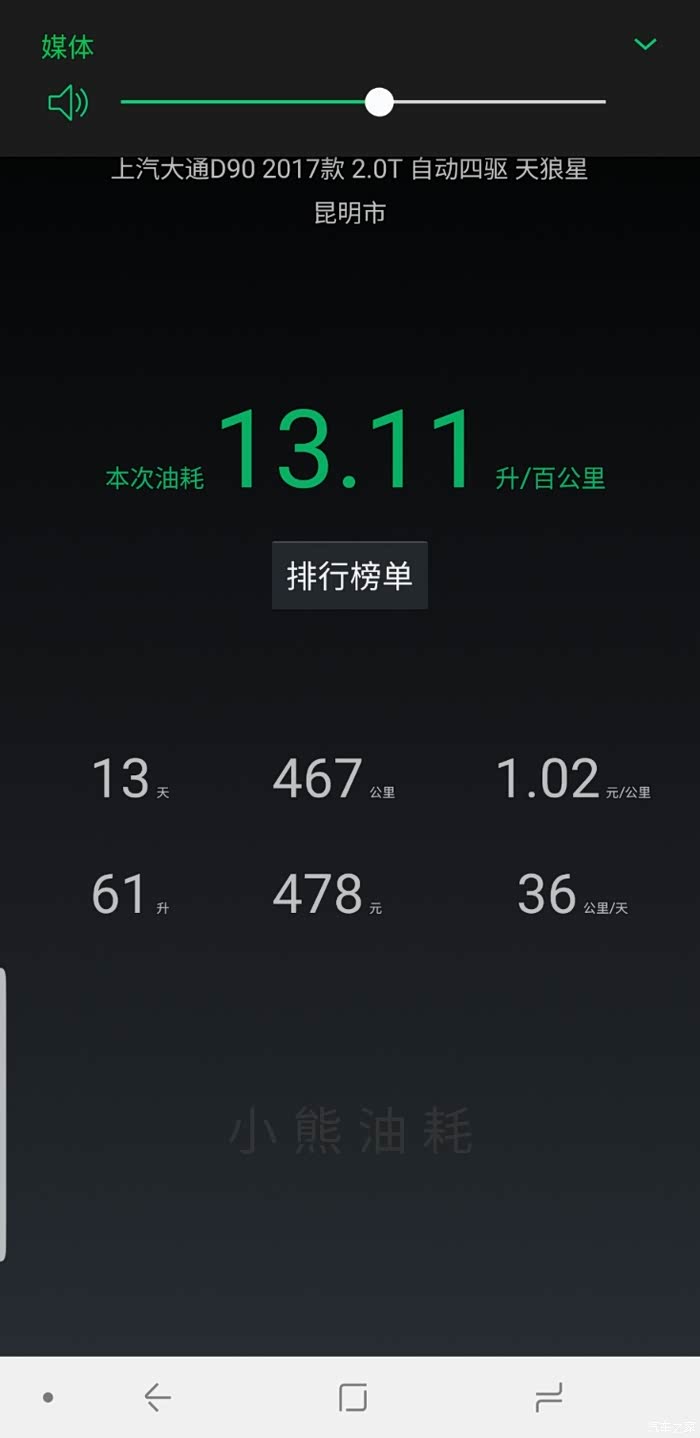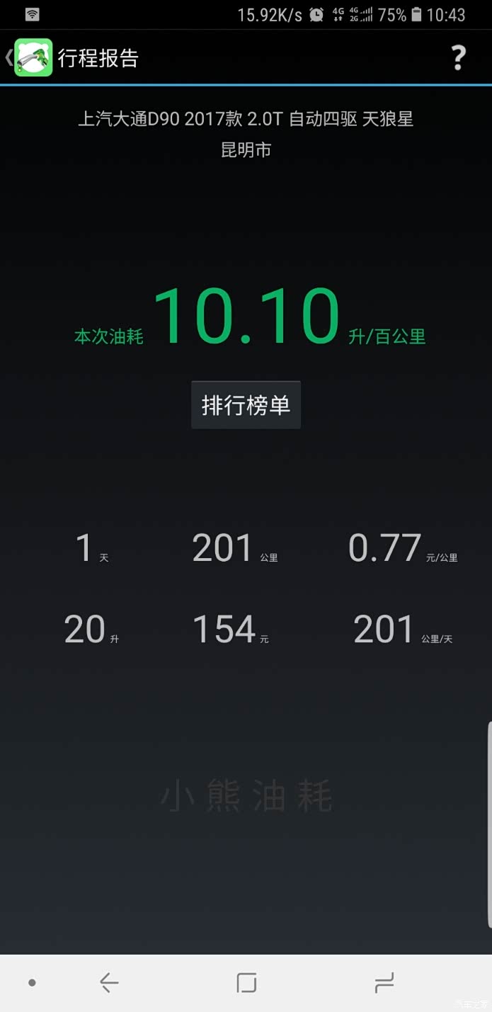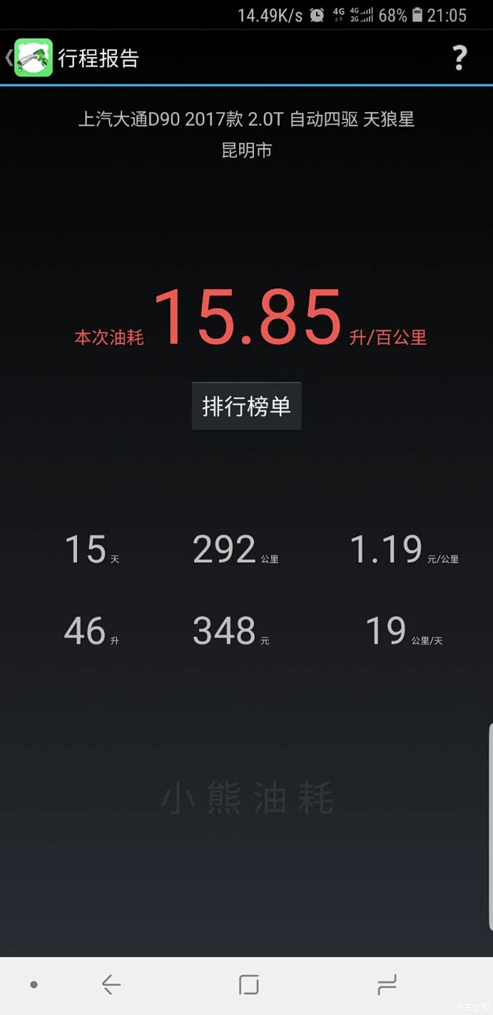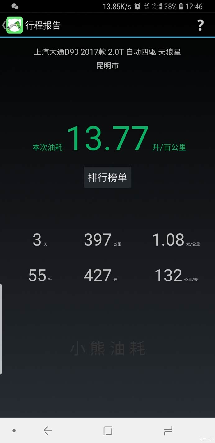 下面是我用小熊油耗统计的,最低百公里7.4个油,最高百公里15.8个油,大部分时间是百公里13个油左右