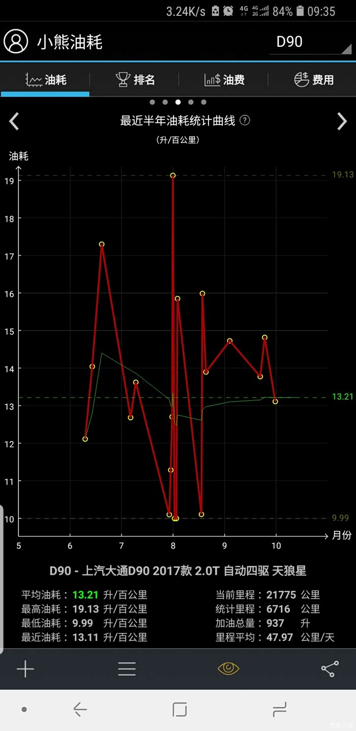 首先是D90自带的油耗统计分析数据,最低的是百公里6个油,最高应该是百公里19.5个油,大部分时间是10-12个油