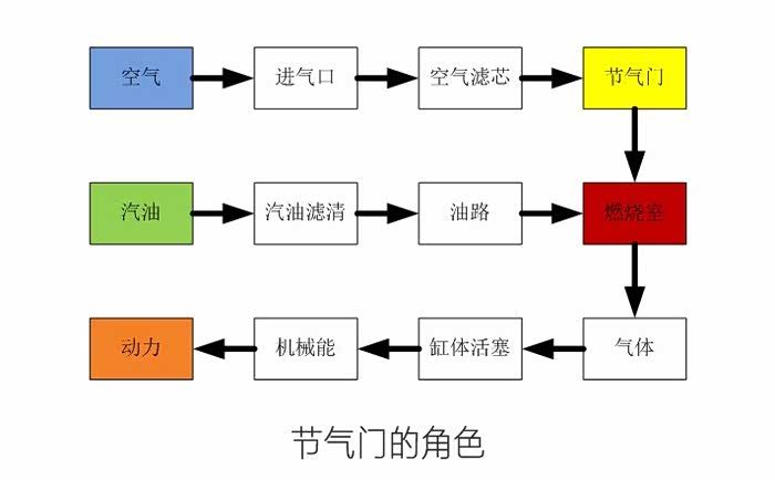 节气门如同一个开合的扇叶,通过油门响应,控制节气门的开合,我们的脚踏板油门,直接控制了空气和汽油的输送数量,油门深踩,意味着汽油需要更多,同时,空气也要更多,此时节气门需要把开口张大,此时也可以把节气门想象成我们的嘴巴,嘴巴闭合,控制吸气,关则气体不进,小张口气体进入少,当我们需要更多氧气时,就要张大口,气体充分进入肺腔。