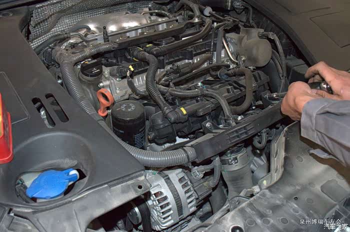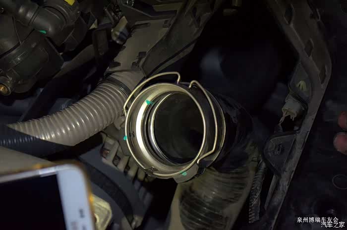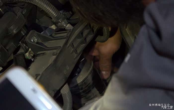 这就是1.8T发动机的节气门所处位置,空间狭小,器件有多,手伸进去,可以活动的空间很有限,车友在确定螺丝位置。
