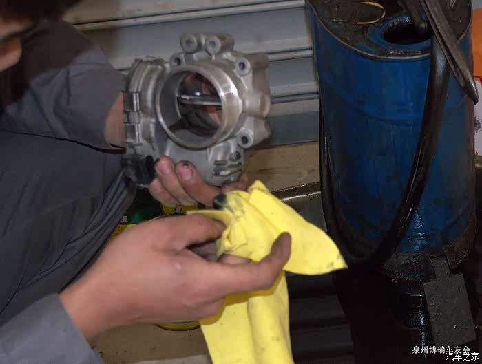 注意一下黄色抹布,是擦拭过的,黑黑的有没有,是油泥,节气门长期近期工作,一定会有油泥的,不可掉以轻心。
