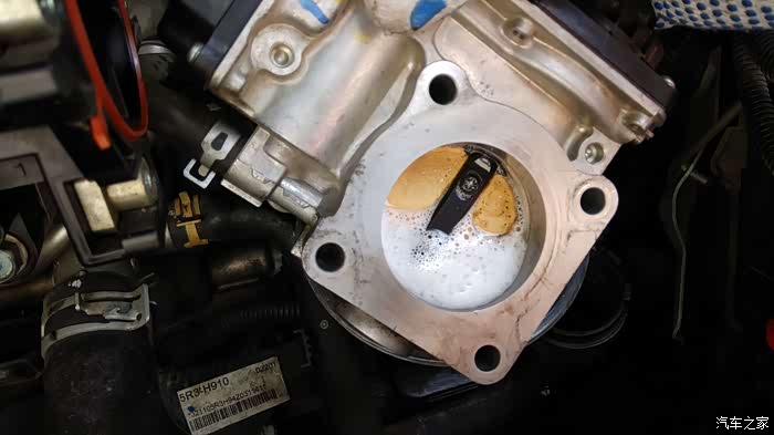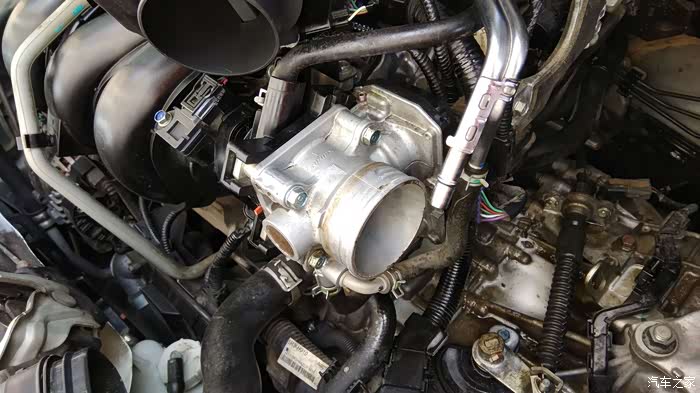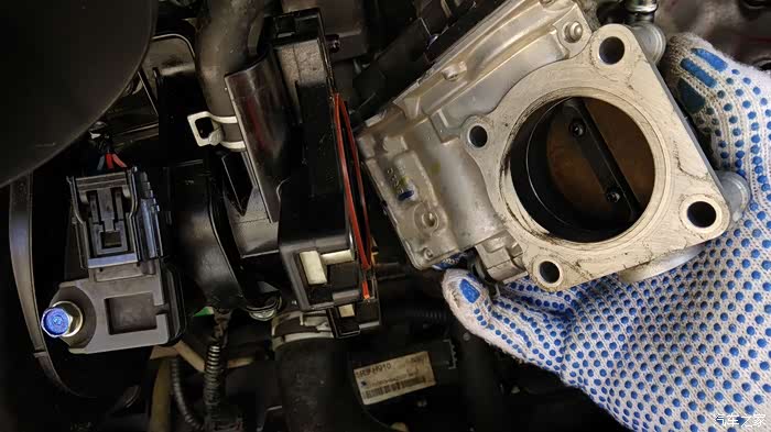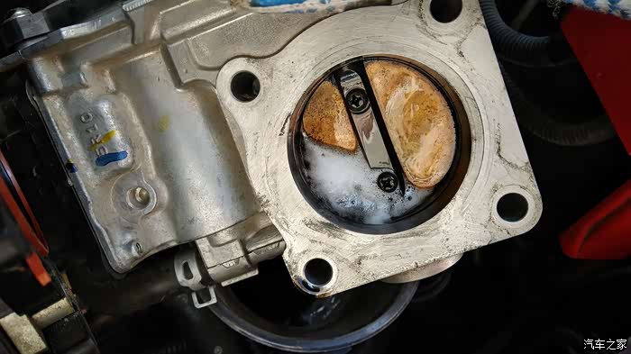 松开节气门四周四个固定螺钉,成功拿下节气门体。节气门背面可以说,非常的脏了,怪不得会抖动。
