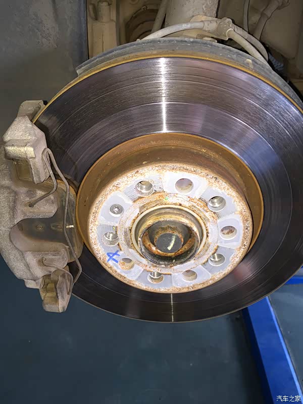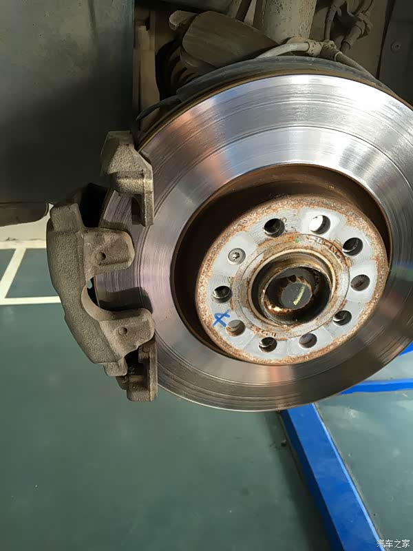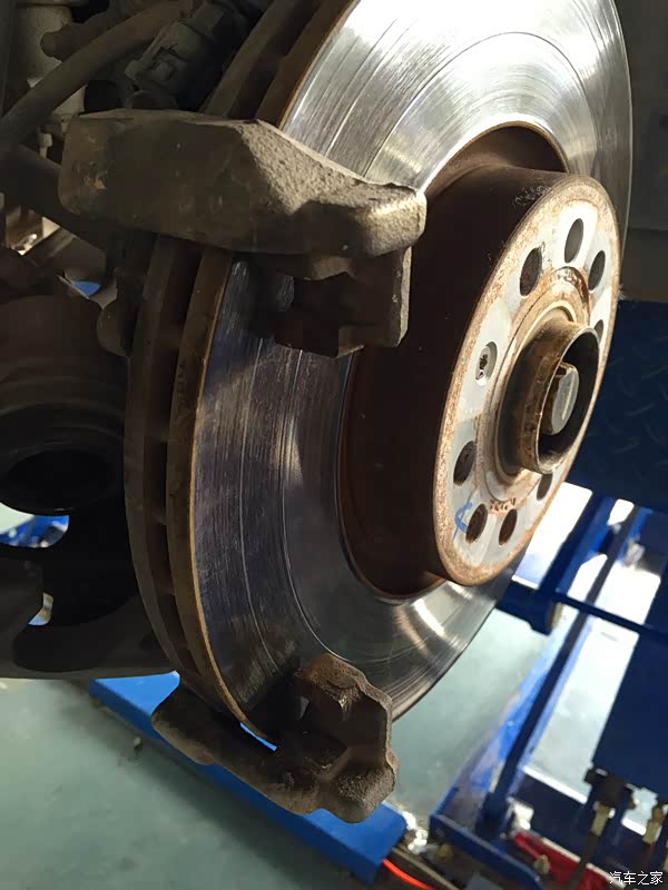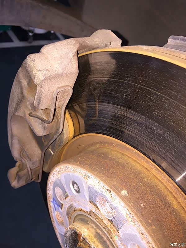 看下装好的新刹车片,刹车盘上面有明显的凹槽了。