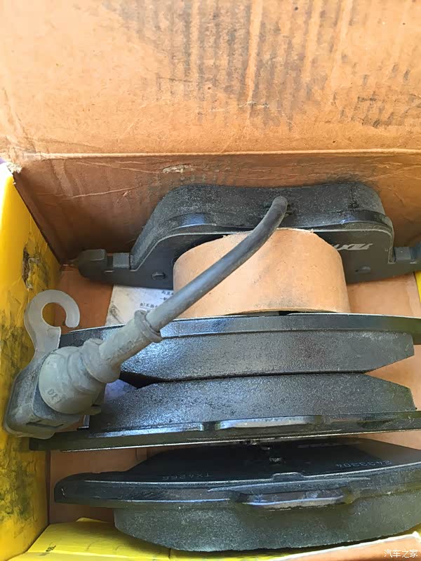 前刹车片包装盒,虽然有充气垫保护,但是经过长途运输包装盒还是凹了。