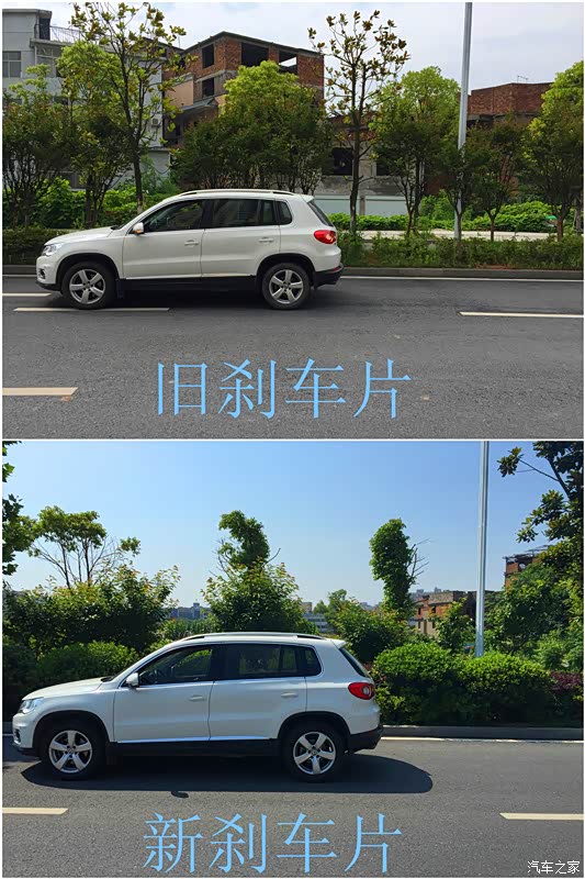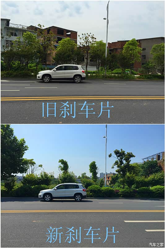 由于没有可以测试100-0的刹车距离条件,也没有专业工具,最最重要的是我也没那个胆去测试,所以我就测试最最普通的40-0的刹车距离,当驾驶位在那个灯杆的时候踩下刹车,这个测试偏差应该蛮大的,但是至少反映出新刹车片的制动效果还是要好一点的。