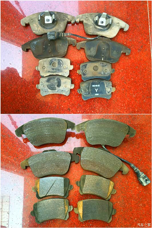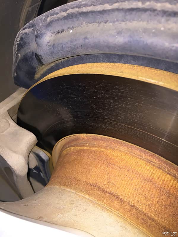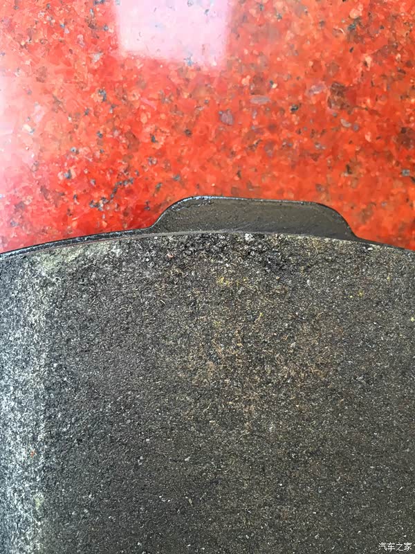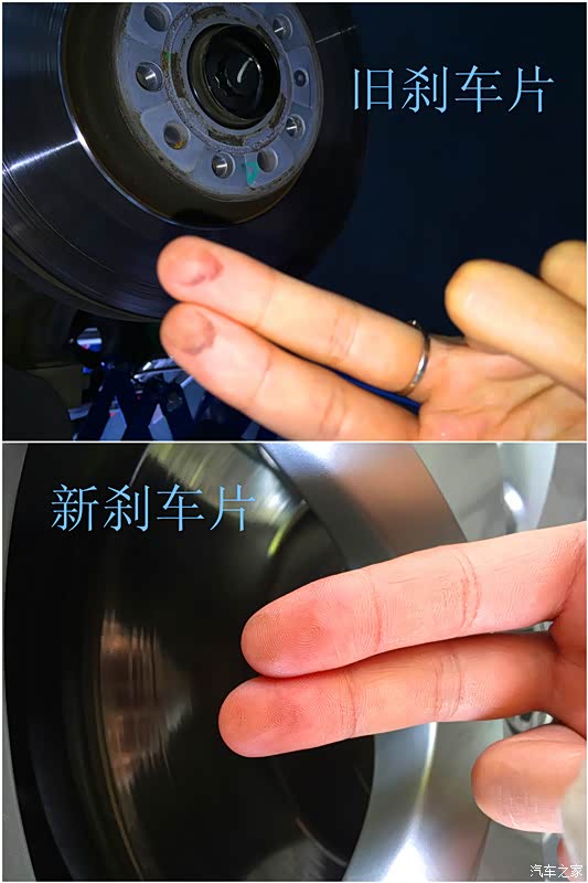 对比了下新旧刹车片在刹车盘上的灰尘,就刹车片明显的更黑。