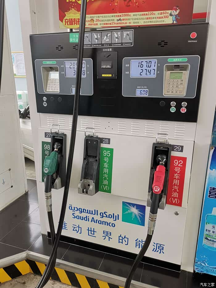 完成加油。是不是有人想说95号的油怎么可能6.08元,淡定,不要慌。请你看一下在加油的油枪座是不是写着95号油,或者你可以忽视价格之间看加到跳枪一共加油27.47升。