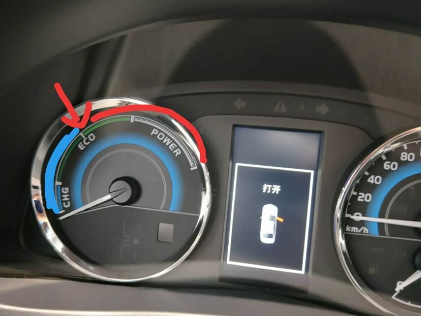 图中我从ECO正中小格,把表盘一分为二,(1)我画的蓝色区域是CHG+ECO的一半。指针在这个区域,车辆行驶是纯度模式,速度大概是40-60,买车的时候销售顾问说60以下纯电,只是大概说法,她当时要是告诉我这么复杂,我就晕了。(2)我画的红色区域是POWER+ECO的上半部分。当指针超过ECO的中线(红色箭头所指)车立马切换油电混动运行,不是纯电行驶了。