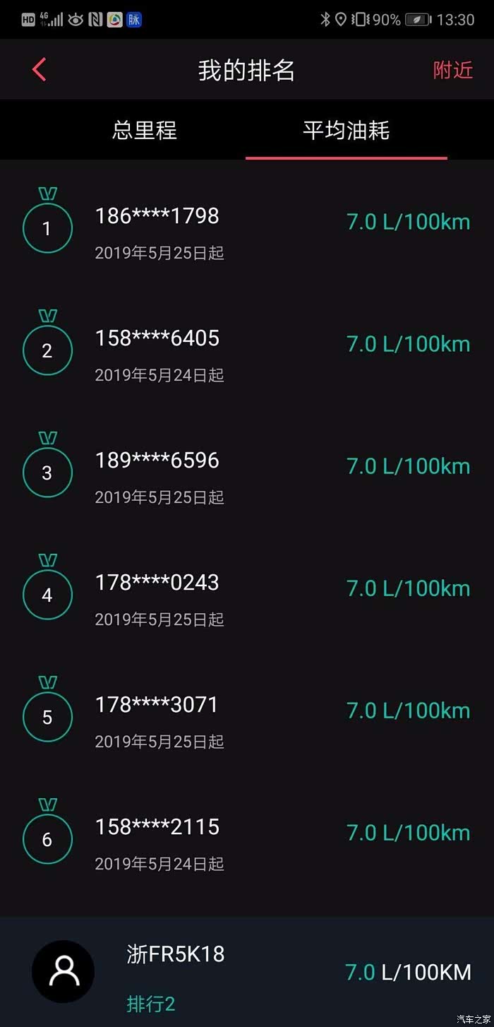 APP上显示的自己的油耗,全嘉兴排名第二。话说,谁是第一了?
