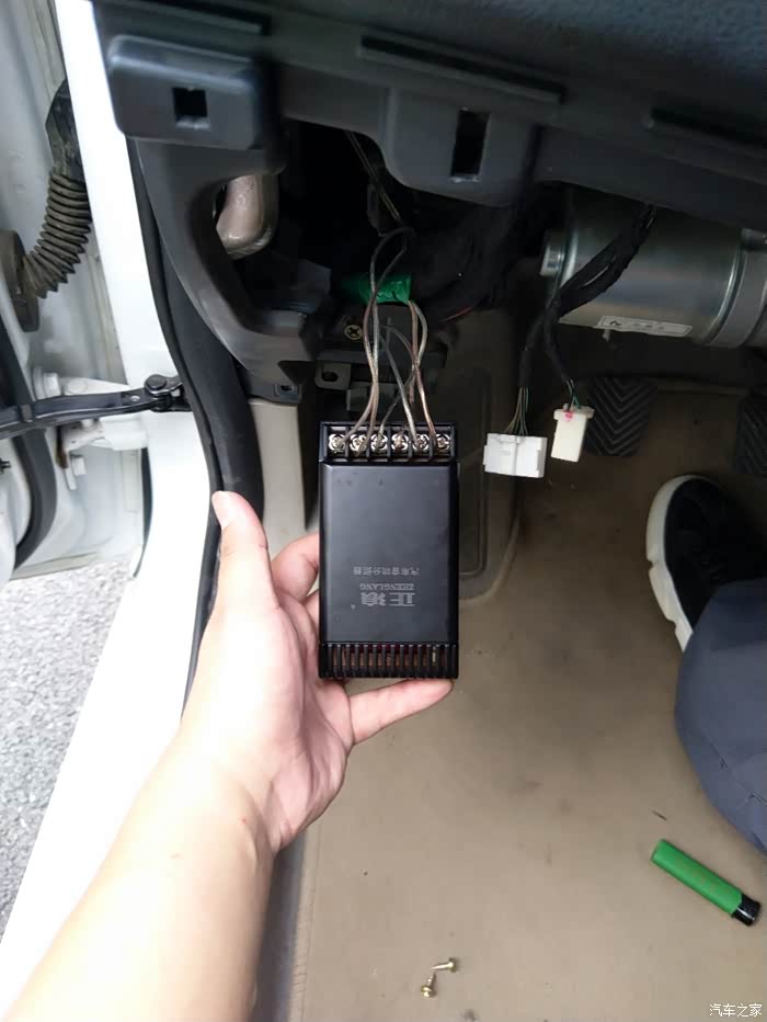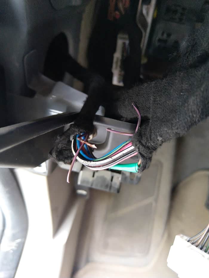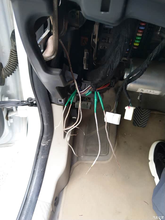 方向盘下面的挡板拆下来,用手进去找到穿向左前门的那捆线,剪开外面的那条黑布,找到刚才说的棕黑和棕土黄那条线,剪断。