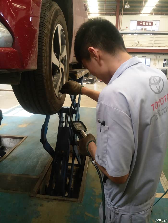 另一个师傅检查胎压