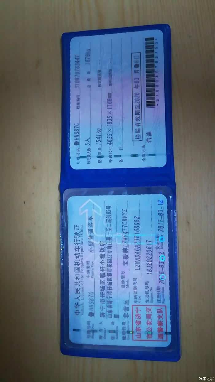 各位,我先介绍一下我自己吧!我原来的工作就是修车的,在汽车维修行业做了一辈子,早期修理过大货车,后来去了4S店干,还先后担任过一汽大众的站长通用别克和通用雪佛兰的站长(当了一辈子孙子,现在终于我也当一回爷),还干过广汽丰田的服务经理传祺的服务经理,地道的老北京人,目前快退休在家了,儿子在济宁开一饭店,我就过来帮个忙!刚好济宁这边要来回北京跑,北京原有一台SUV,家里还有老人也要用车,所以,准备在济宁再多买一台车,春节后开始关注宝骏530,心里想我要购买宝骏530会考虑三个问题:第一这车看上眼的配置预售价是118800,宝骏的车通常都是8-9万左右的,值不值这个价?第二,新车上市会不会掉价,目前其它品牌都做价格促销,第三,那么大的家伙油耗高不高,动力够不够? 现在有的SUV真的是不行,靠的是营销手段做的好在疯狂卖车,发动机噪音像拖拉机,油耗高照样热销,我自己是搞维修的,当然会给自己选一台好车了!在3月初我去了宝骏济宁的4S店,刚好有台宝骏530的试驾车,一试驾,让我马上改变了原来对宝骏的看法,1.5T的发动机动力足够,我还特意把家人都叫坐上去,动力真的足够了,而且,发动机怠速的时候非常安静,别忘了我是干维修的出身的,立刻交了订金,车在5天后上了济宁牌,用的是儿子的济宁营业执照上的牌!提的现车车价115800,最近听说这车卖的火了,宝骏530全国都要加5000精品了,一个来月,我的宝骏530跑了11000多公里!做了首保和二保了!这个是我的行驶证。