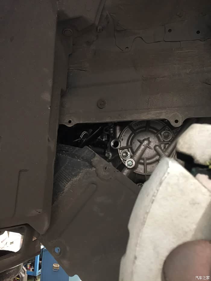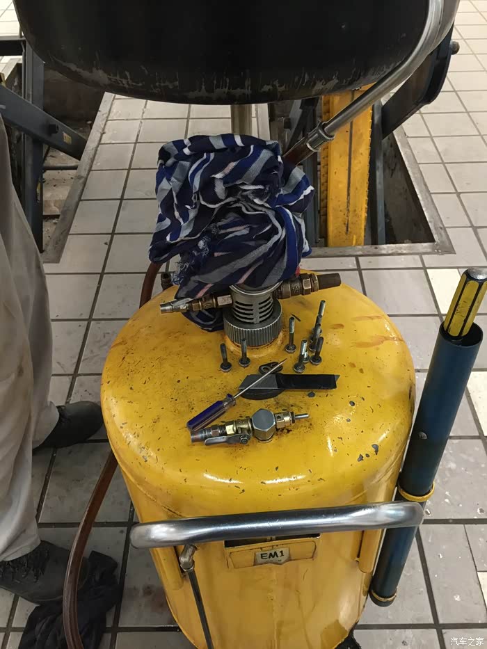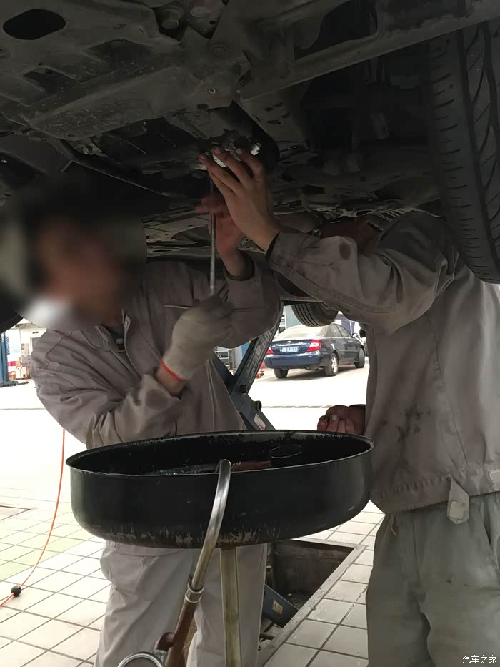 师傅开始装油,这里需要多说几句,装回油量是否足够的判断标准是,装完以后,回拆油底壳的一个螺丝,看是否有油漏出,若有就足够,若没有就继续添加