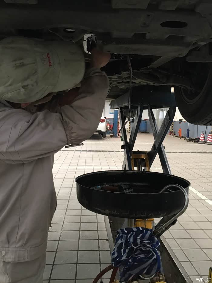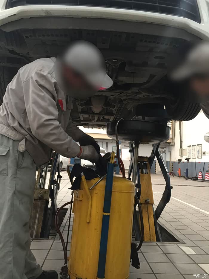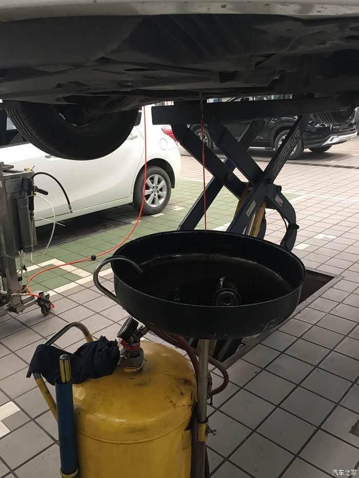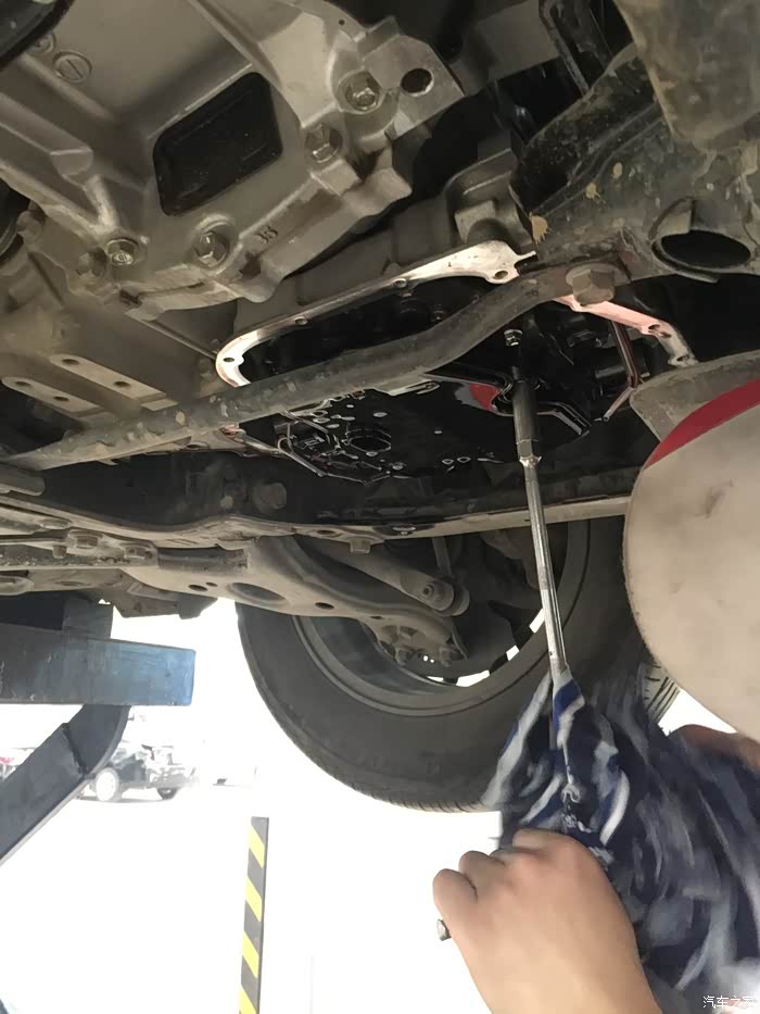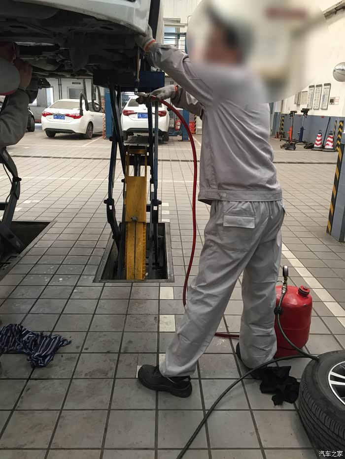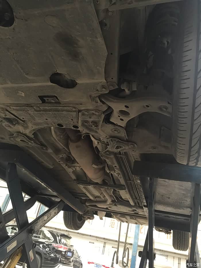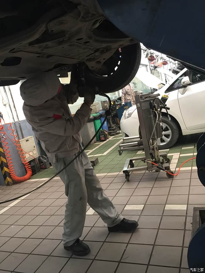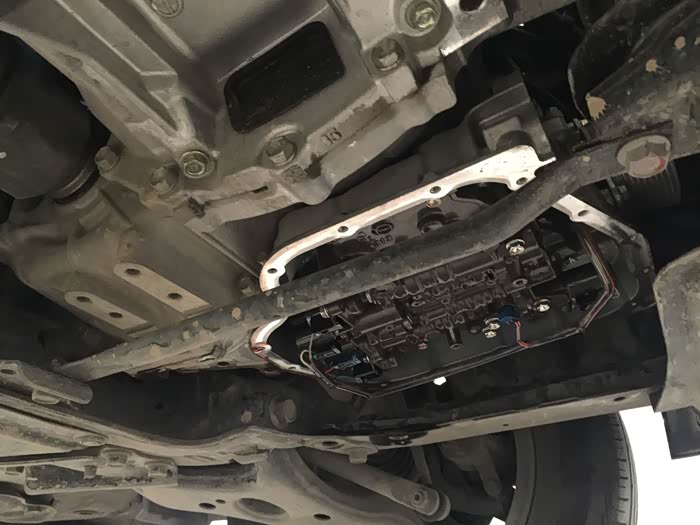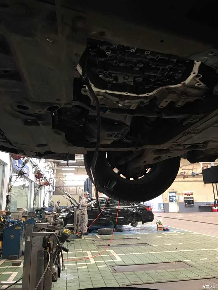 上楼等待期间,大概等了20分钟(并未有服务员提供饮水服务),接到电话,告知电磁阀有问题,让我下去。当时有点懵,在下楼过程中,明白了是变速箱的电磁阀。车子被升起来,我跟师傅一同站在车下听声音,说实话,我是没有听出来有异响以及大家所说的所谓的口哨声,但是4S师傅说有一点,很轻微,换电磁阀可解决