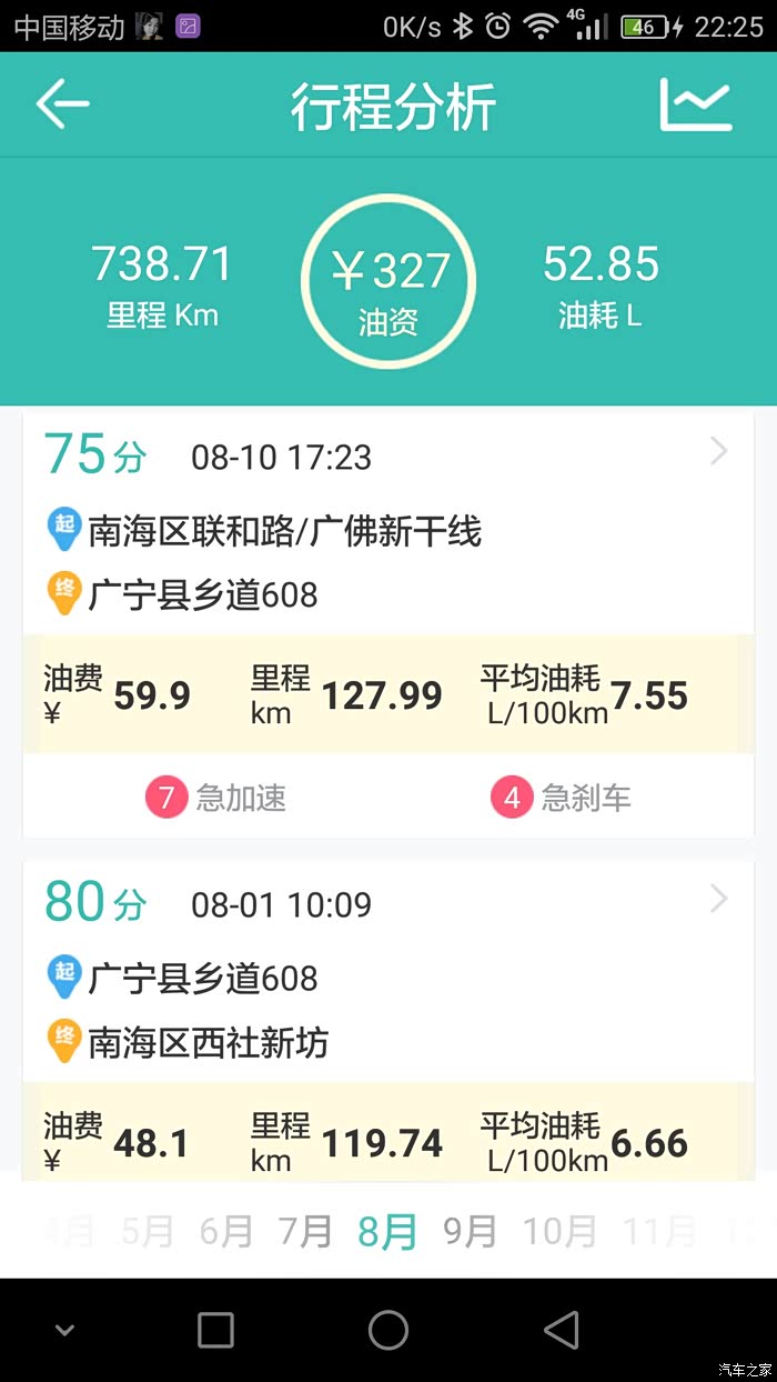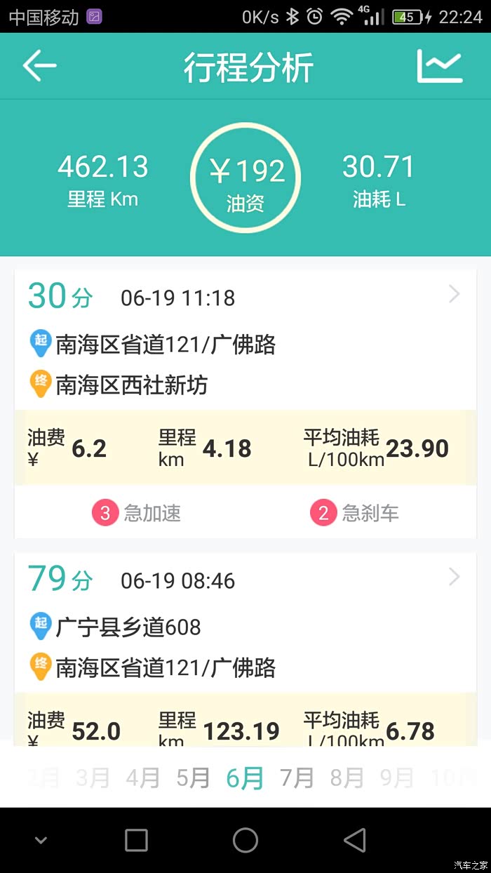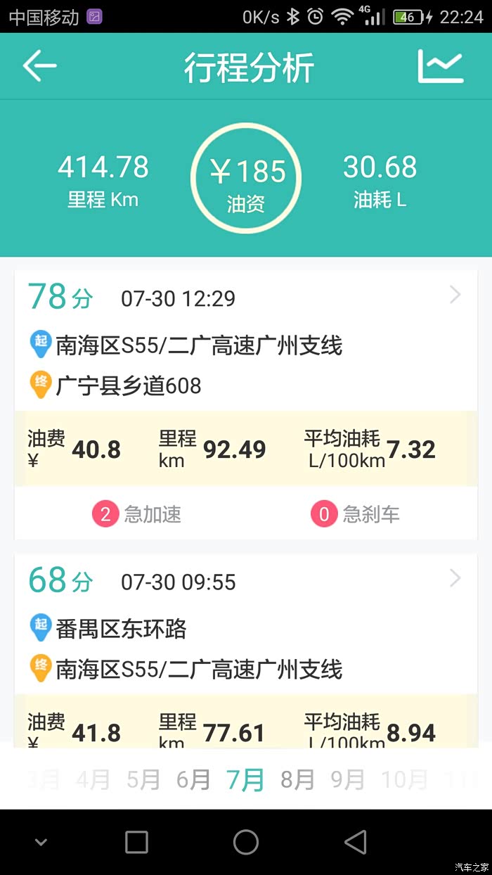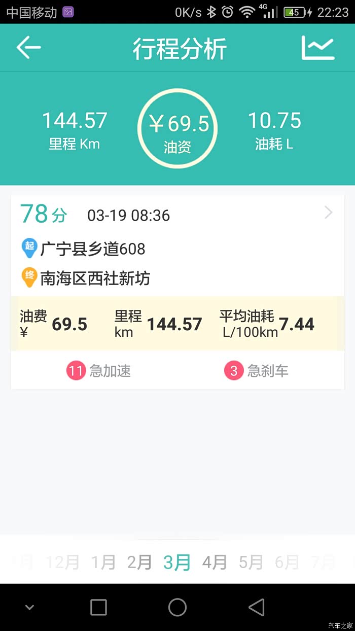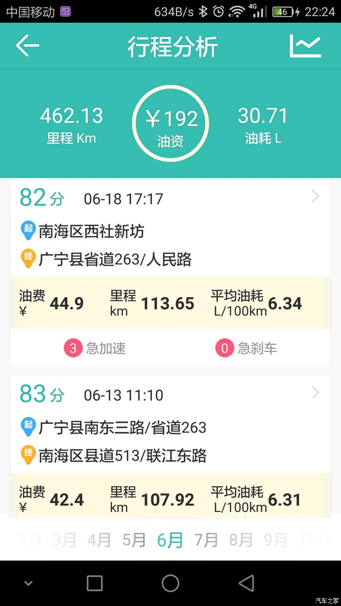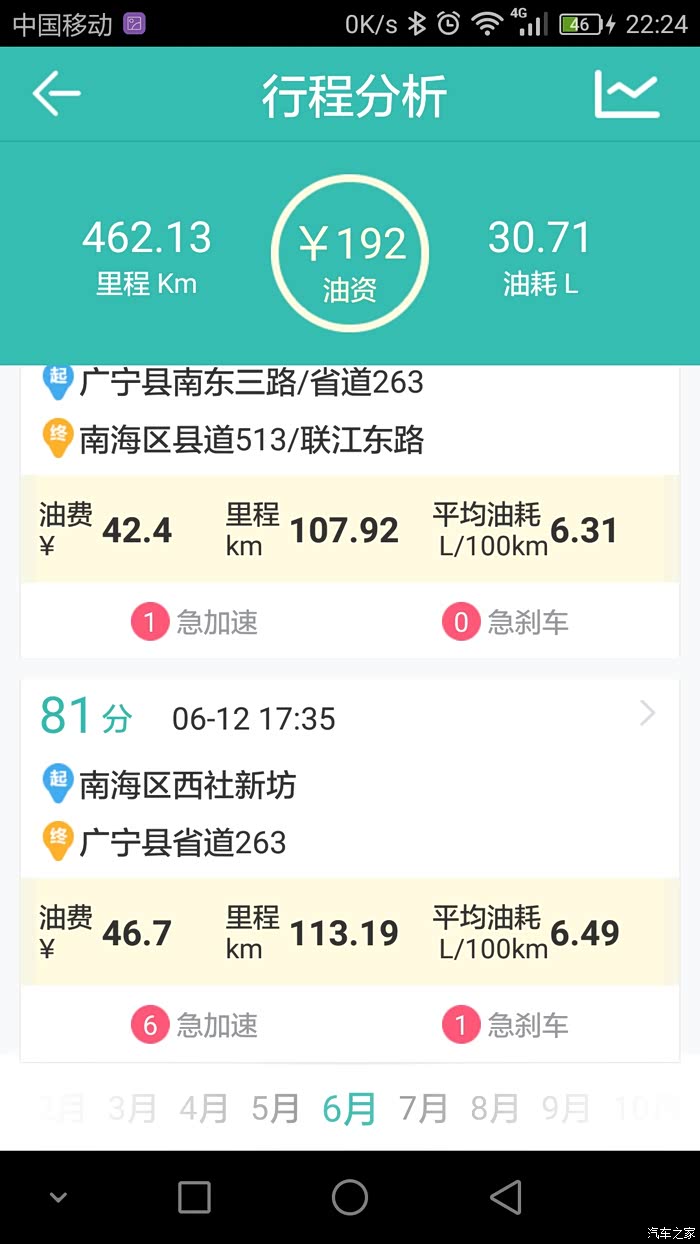 本人用的是图吧安全卫士,油耗记录路线基本很多相同,就是我上班跟家之间的来回,基本每个月最少回家一趟,路况的话除了当中有几次仅30多公里的高速其余的都是环城加省道。其余的譬如公里数在120左右的当中就有100公里的高速。至于载重方面,除了一月份那次是一家人(老爸老妈,老婆,两个小女儿,大哥)到珠海玩之外其余的基本不会超过3人。平时上班外出不用开自己的车,所以小三基本是回家时开的。至于高速时速我一般跑100到110,偶尔上一下120.大家可以参考记录的平均时速。
