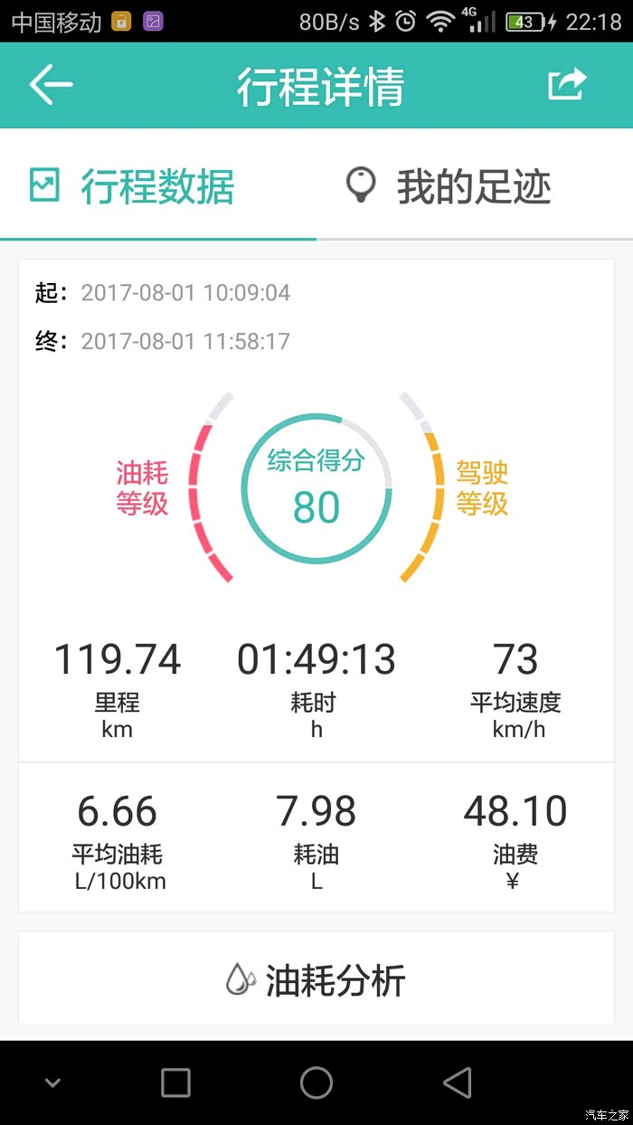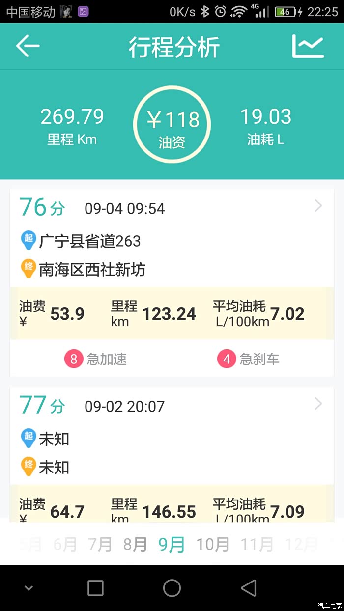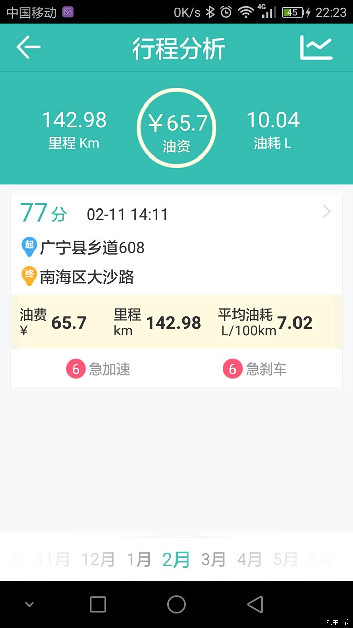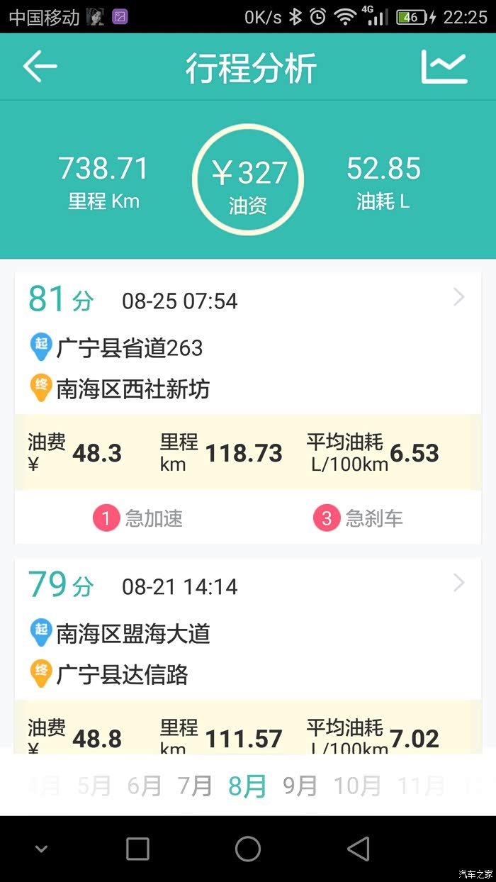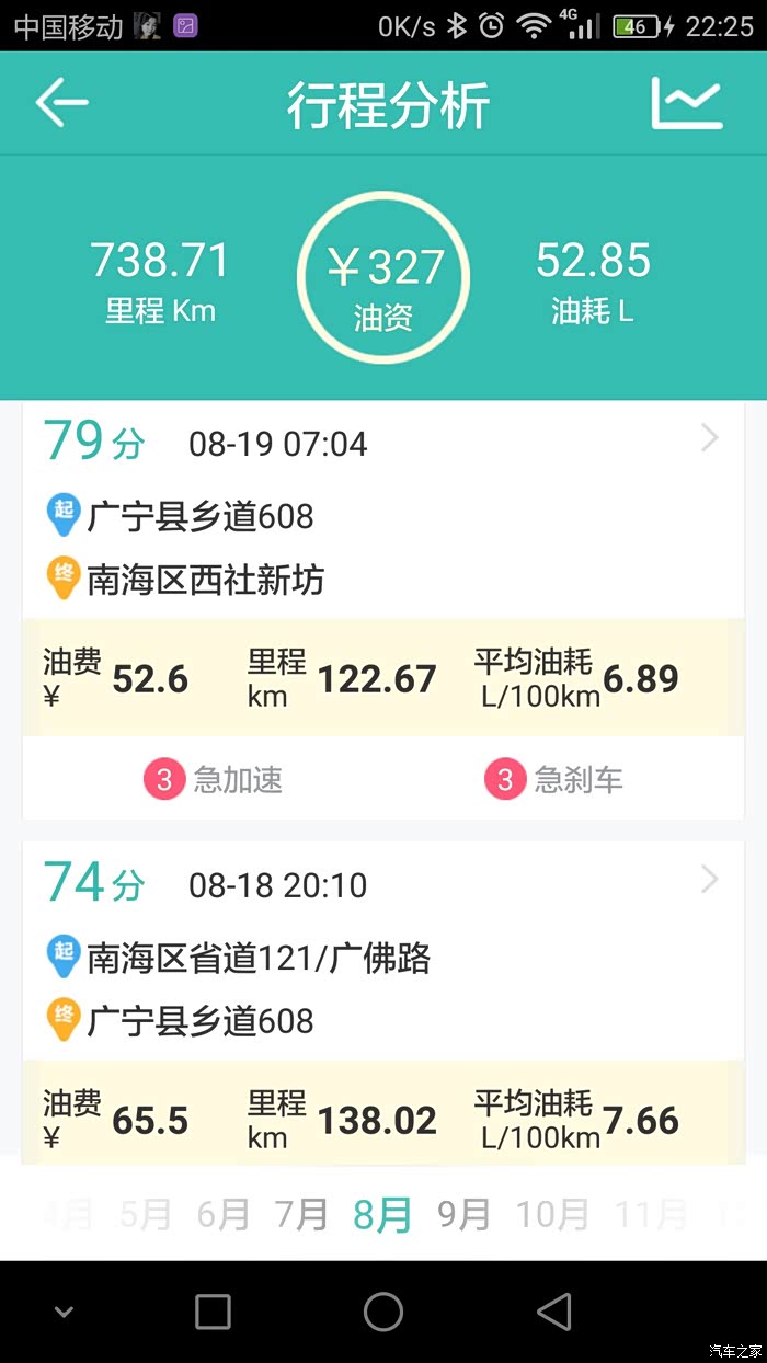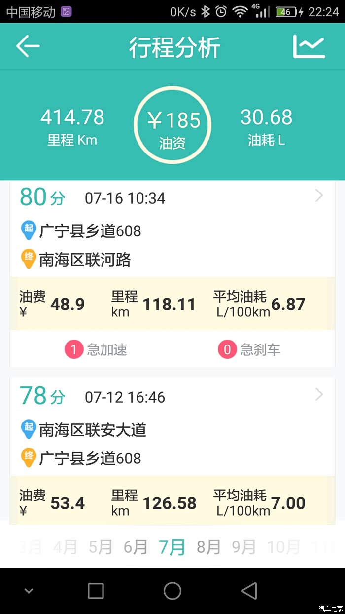 本人用的是图吧安全卫士,油耗记录路线基本很多相同,就是我上班跟家之间的来回,基本每个月最少回家一趟,路况的话除了当中有几次仅30多公里的高速其余的都是环城加省道。其余的譬如公里数在120左右的当中就有100公里的高速。至于载重方面,除了一月份那次是一家人(老爸老妈,老婆,两个小女儿,大哥)到珠海玩之外其余的基本不会超过3人。平时上班外出不用开自己的车,所以小三基本是回家时开的。至于高速时速我一般跑100到110,偶尔上一下120.大家可以参考记录的平均时速。