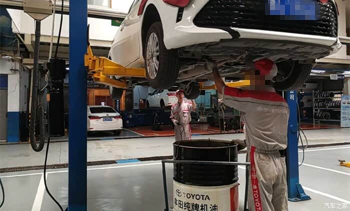 车子放机油中,黑黑的机油排放出来啦。