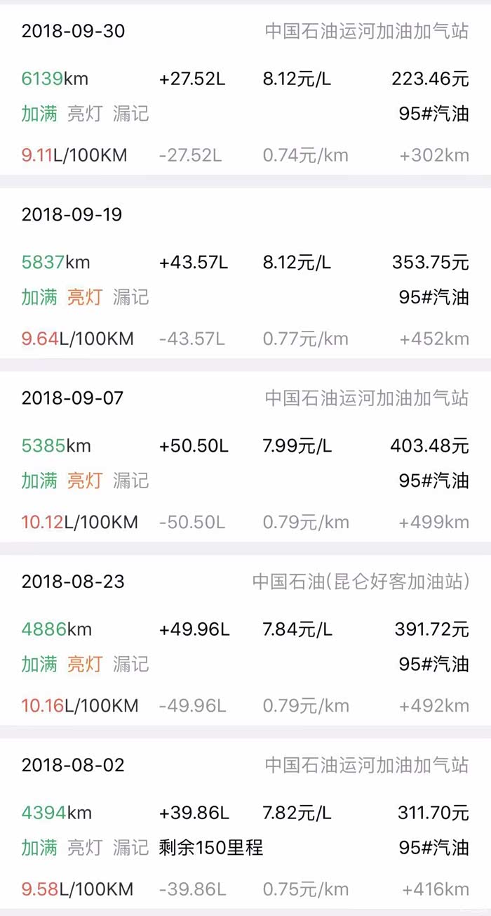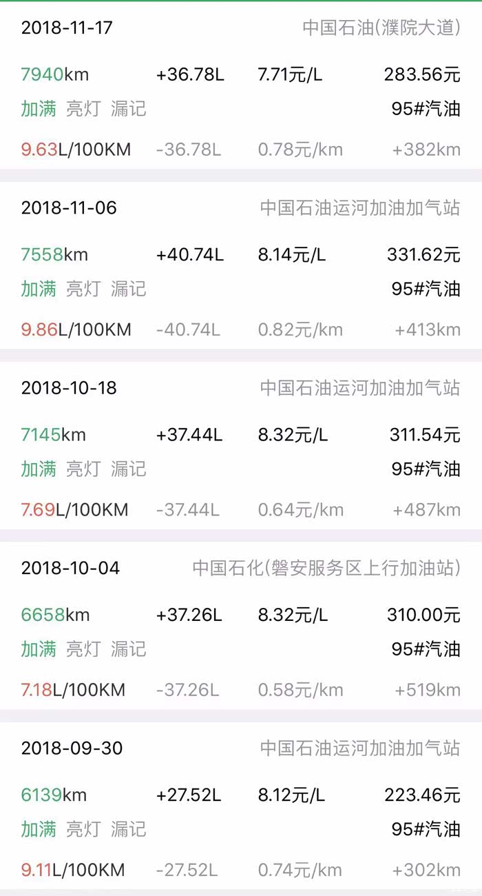 楼主有个好习惯,就是每次加油都用记录油耗的软件记录一下,其中包括加油时的里程数,油价,总加油金额,升数,都会一一记录,而且楼主每次加油都会加满,因为这个APP也只有在加满的时候才会计算出准确的油耗,又经过从7月第到目前接近11月底的这么一大段时间,楼主的油耗记录软件又有了不少数据,下面我们简单的聊聊油耗这个事。