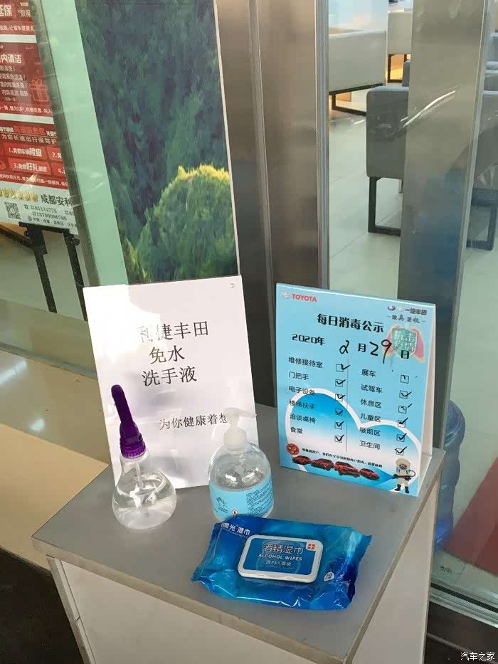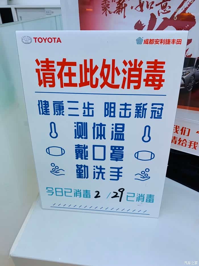 到处都有提示板,展示今日已消毒,看来4S店确实是防疫措施做得挺好。为了我们消费者的健康考虑的比较周到
