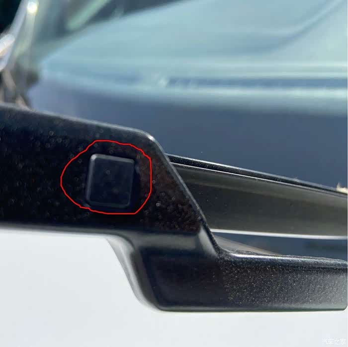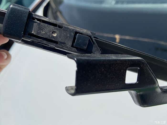 然后按雨刮上的这个按钮,再往外用力把雨刮胶条给换下来