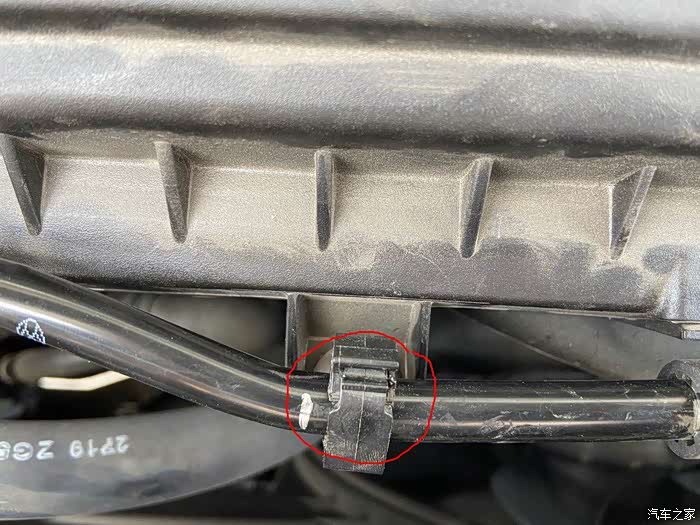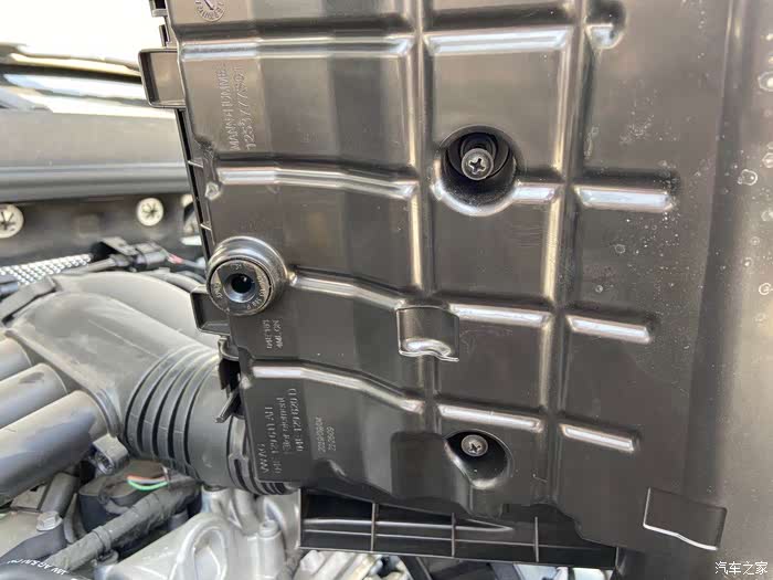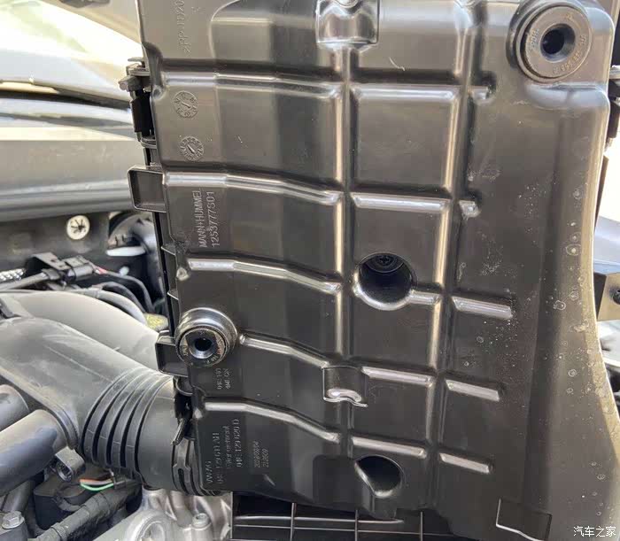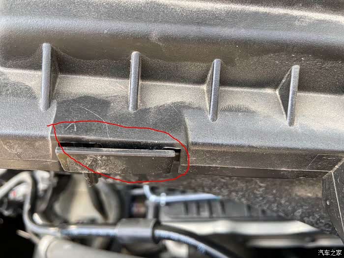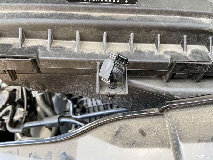 在空气滤芯盒上,有根管道固定在上面,需要用平口螺丝刀别开卡扣。这个过程需要慢一点,不要把卡扣别断了