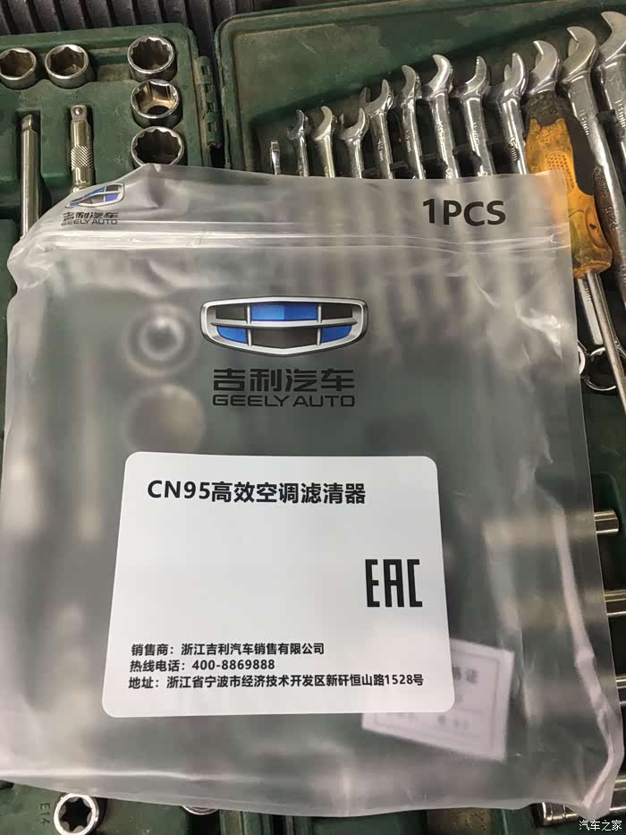 细心呵护的博越。这是一次常规保养,更换全合成灰壳机油、机油滤、空气滤,检查了底盘、胎压,添加了防冻液,整个过程师傅非常认真细致,又一次大赞吉利的售后服务!当然还有厂家免费赠送的CN95高效复合空调滤!我对于保养的流程已经很熟悉了,CN95高效复合空调滤倒是很吸引我。博越让我们的出行更加安全!