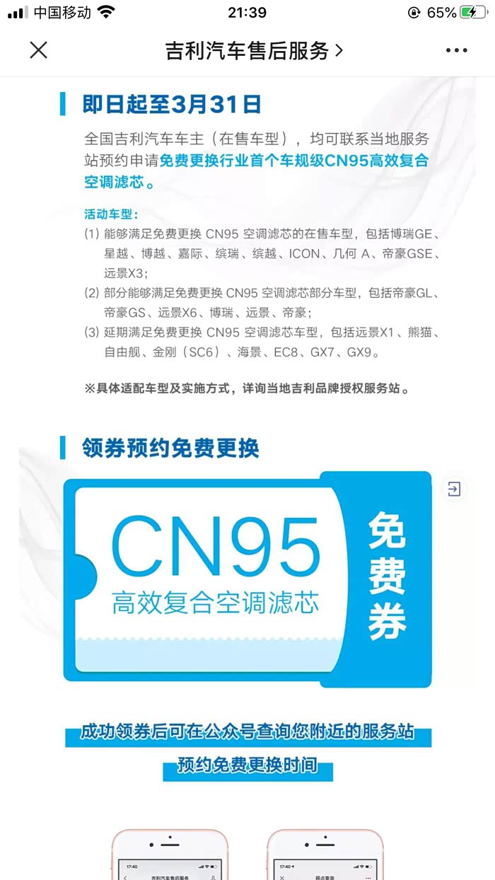 吉利刚刚试制出“车规级CN95高效复合空调滤芯”,就面向全国用户免费更换,让我们享受N95级的出行安全防护!