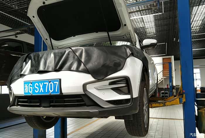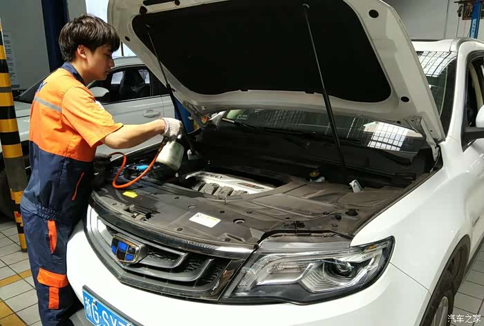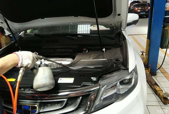 发动机舱给博越垫上保护垫,以免工作人员给车误造成伤害