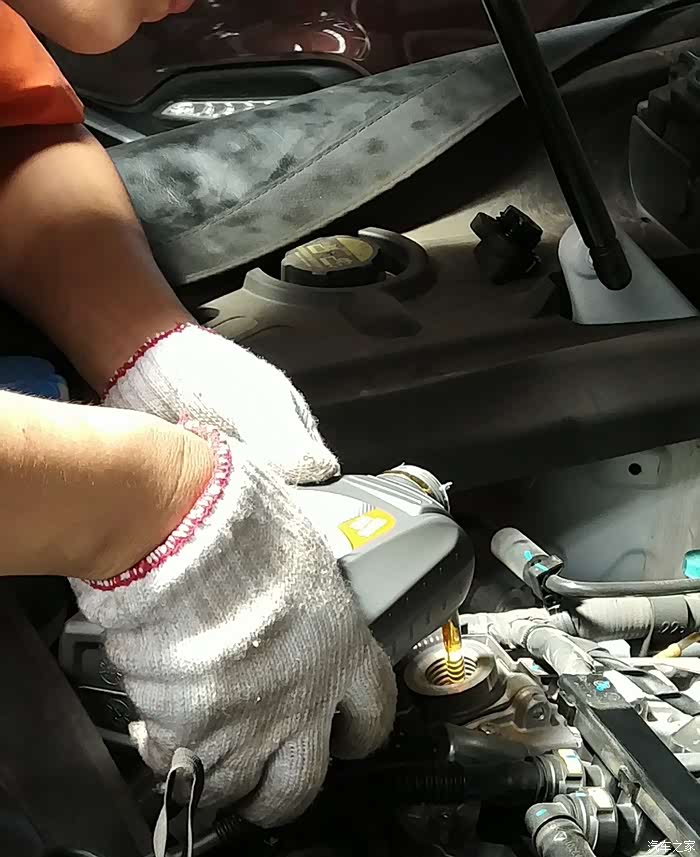 颜色很纯正的,机油加完再换上新的机油滤芯,因为第二次做的常规保养,所以就换了机油和机滤。