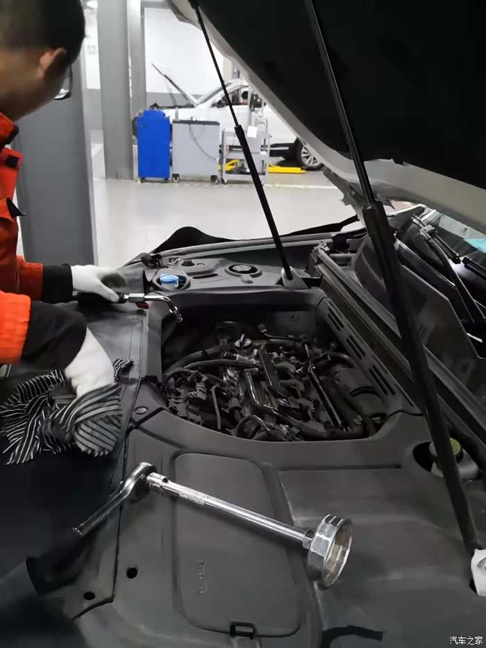 很快 自己的爱车就到保养工位了,各项准备工作开始