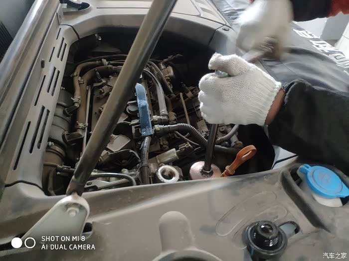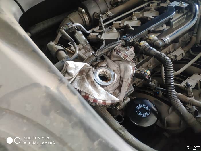 机油滤清器换好后,准备换机油,维修人员还用抹布把周围垫上,怕弄脏,服务到位