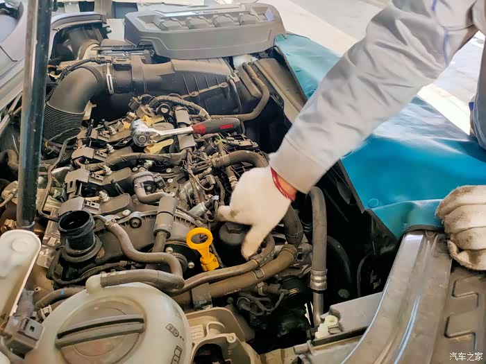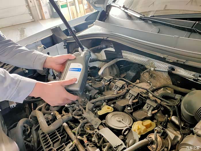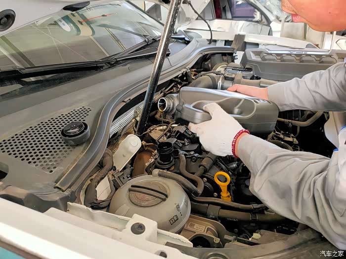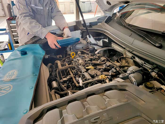 准备放下车辆,更换机油滤芯,机油滤芯跟有些车辆不同,探岳更换滤芯,而不是那个整体更换铁碗。之后就是加注机油了,操作是很专业的,而且维修工跟我说更换的机油比较昂贵,如果车子在出现问题,店内会负责,假如在外面做,店里就会推责,说的挺吓人。
