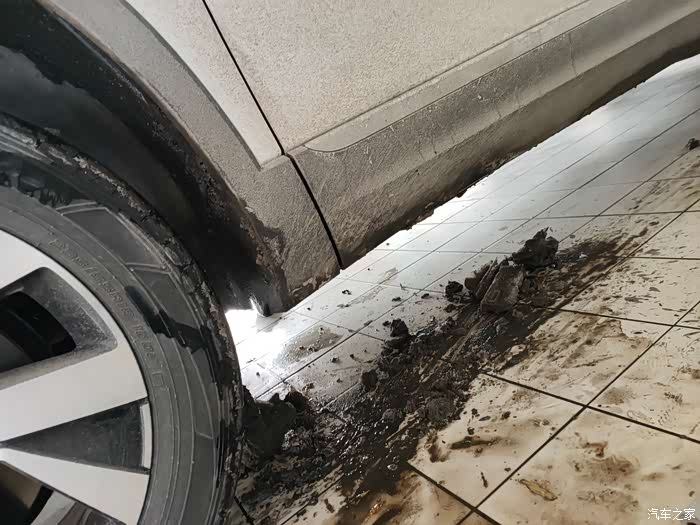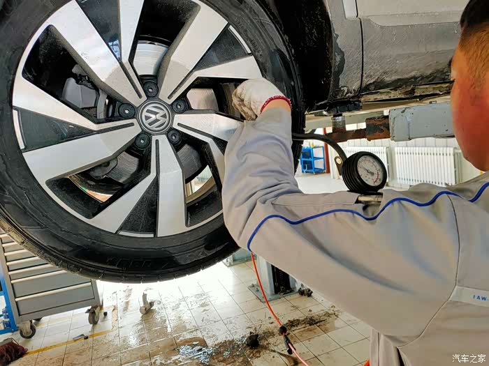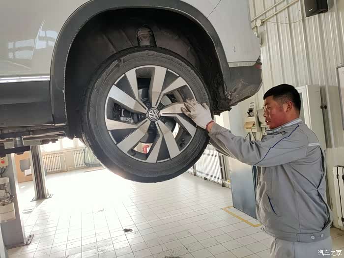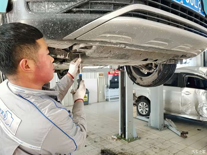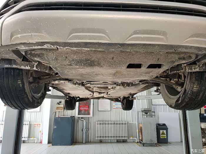 车子被缓缓升起,我们慢慢看清10000公里,探岳车底部的状态,北方的车路由于需要除雪,会撒盐或除雪剂,所以对于轮胎和底盘都会有影响。