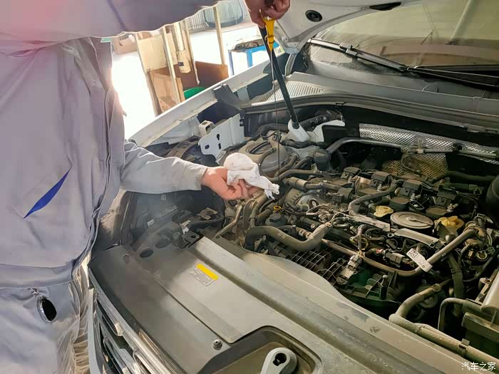 查看油尺,确保注入机油量适当,少了影响润滑,多了会积碳增多、严重会爆缸哦。