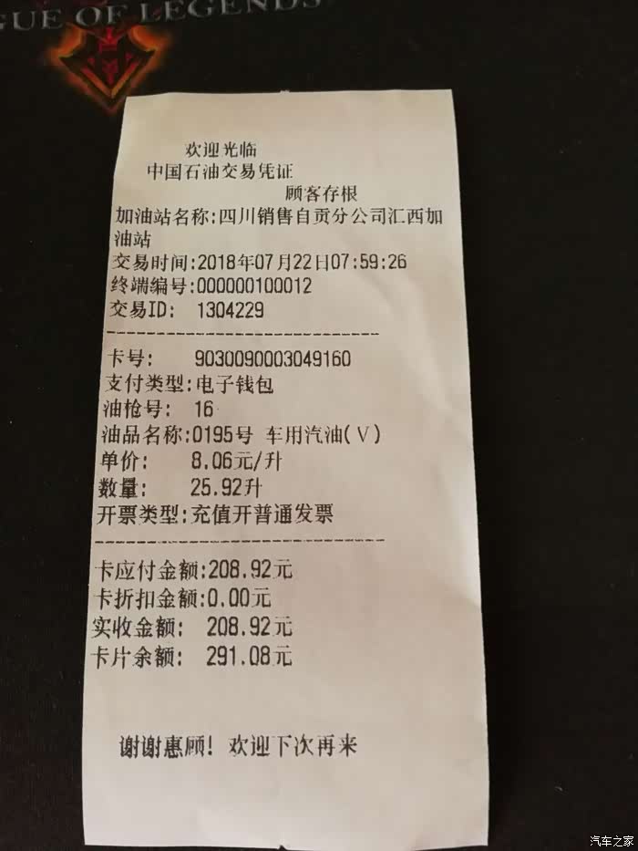 今天的加油小票,这上面显示这次加油到跳枪,一共加了25.92升油。