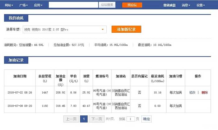 从汽车之家我的加油记录看到我上次加油的时候表显里程是1192,从上次7月8号到今天7月22号,刚好两个星期14天,一共跑了255公里,消耗95号汽油25.92升。