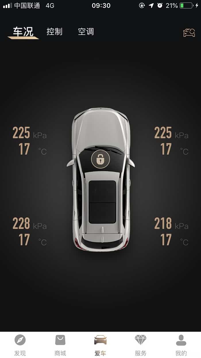 胎压也与APP数据显示一致 前胎225千帕 右后胎胎压微微偏低一点
