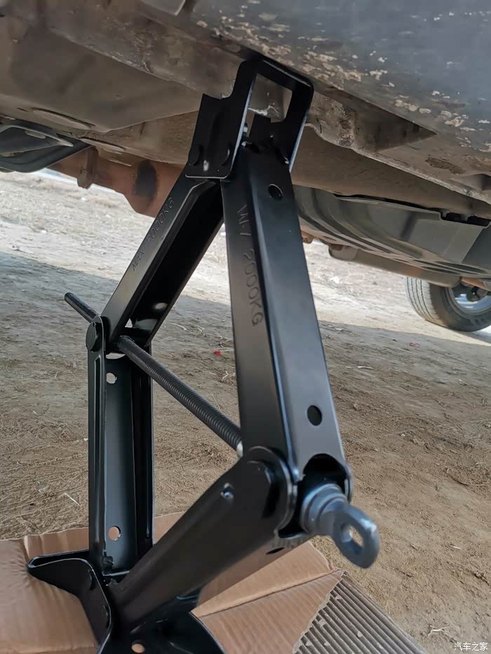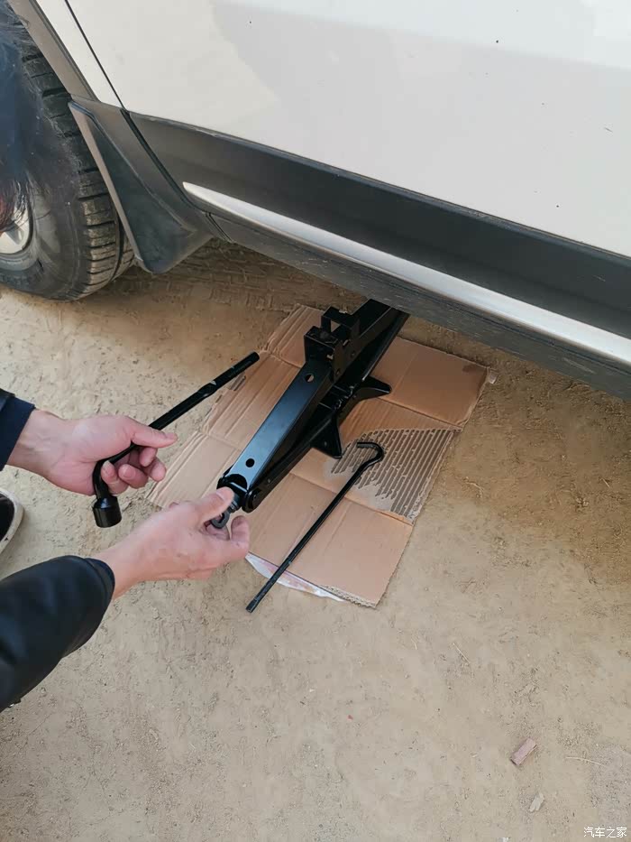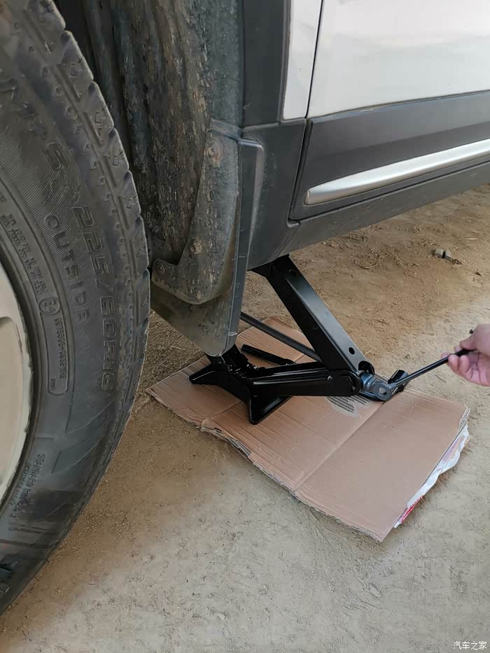 将千斤顶放置在举升点下(放置之前先松轮胎螺丝一圈),然后将千斤顶调整到适合的高度。