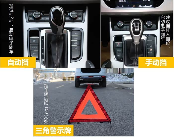 第二步 挂挡位 启动电子刹车 放置三角警示牌