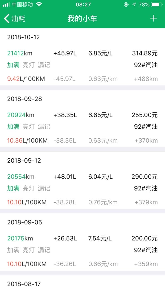 我上次加油是20924公里的时候加的油。