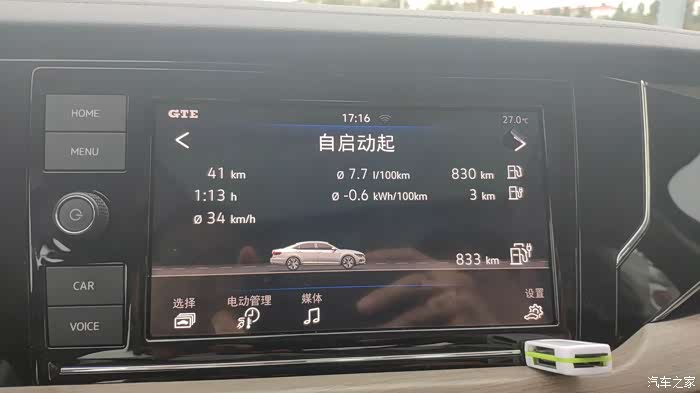 这个油耗大家应该能看的明白不?两行显示,上边那一行是汽油的消耗,2.7L/100Km,这个油耗是我从4儿子店一路开来时所产生的油耗,还算可以接受,其实原本比这还要低一点,大概在2.2左右,因为预存的电已经全部使用完毕了,可以看见第二行显示的电能续航是0,所以用纯汽油发动机时增加了一部分油耗,就变成现在的2.7了。
