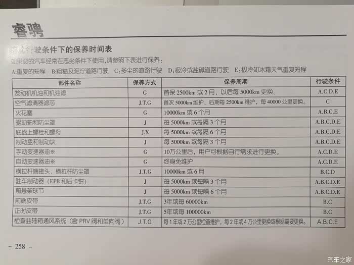 2014年购车至今,四年时间转眼而过。睿骋陪我上山下乡,高速上撒过欢(广西-重庆来回N次),也在泥地里面托过底(本人多出入于建筑工地)。从未掉过链子,每次都把我平安的送至目的地。购车至今,睿骋的使用说明书从未仔细看过,一天闲来无事,翻了下,看到了关于皮带保养这项,顿时警醒了!