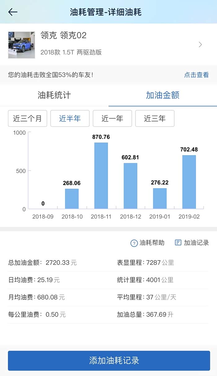 加油金额,油耗跟着油价变动而变动,可能是因为油价降了就不注重省油了,记得以前8块多的时候,开车都是小心翼翼,哈哈哈,油门都舍不得踩。