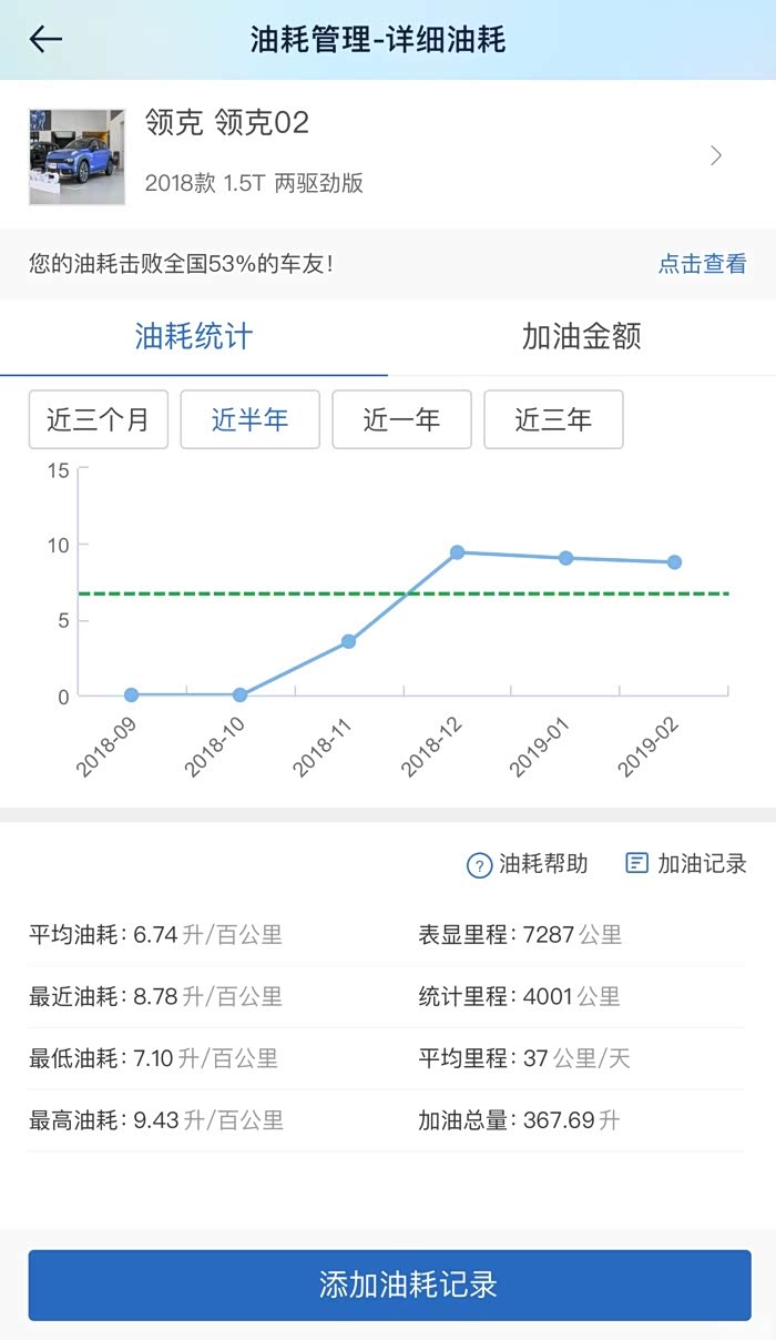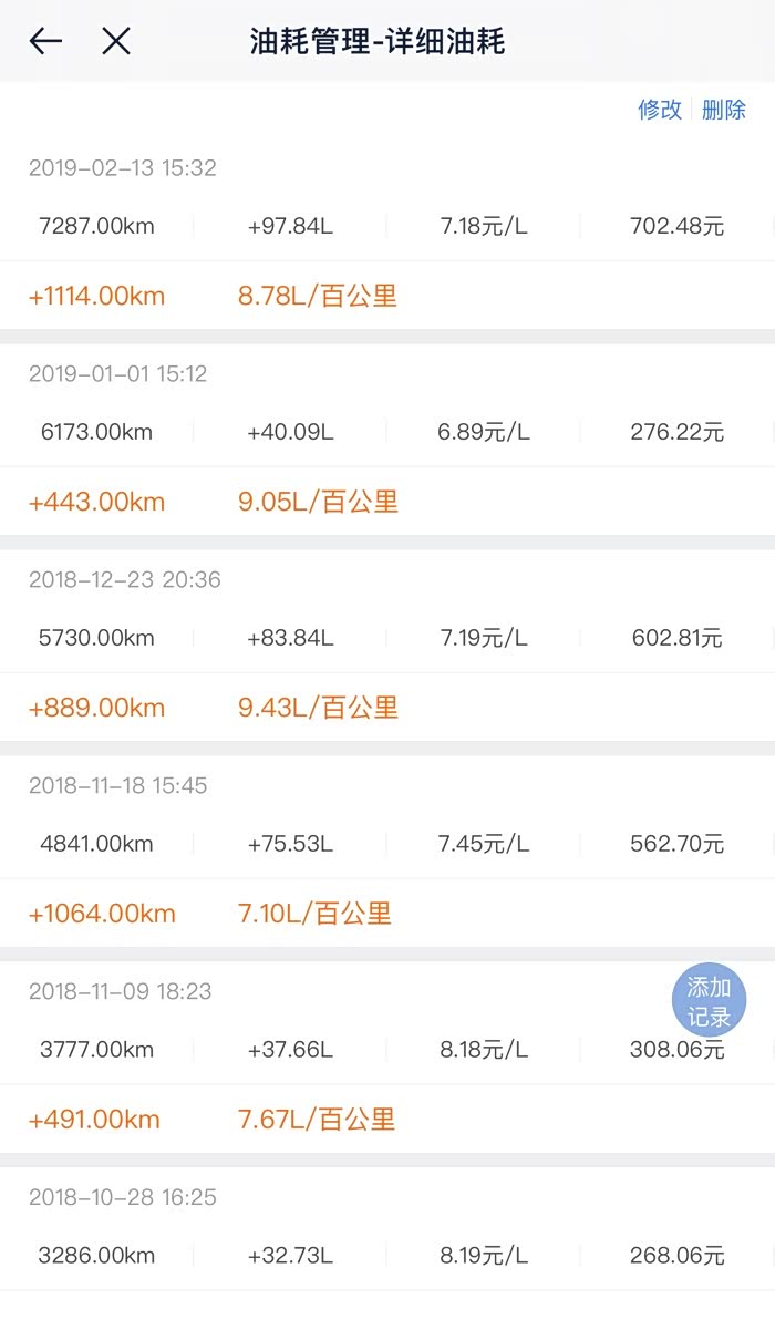 记录油耗是从2018年10月28号开始的,当时里程3286km,也算是过了磨合期了,目前记录到2019年2月13号,里程是7287km,记录里程数4001km。可以看出最低油耗和最高油耗分别是7.1和9.43。7.1是高速跑的比较多,纯高速的油耗大概6到6.5吧,9.43是纯市区跑出来的油耗。平均计算下来的话这4000公里的油耗大概是8.37左右,如果开eco模式应该会更低,还算是比较满意的,毕竟是在省会城市,经常会堵车。